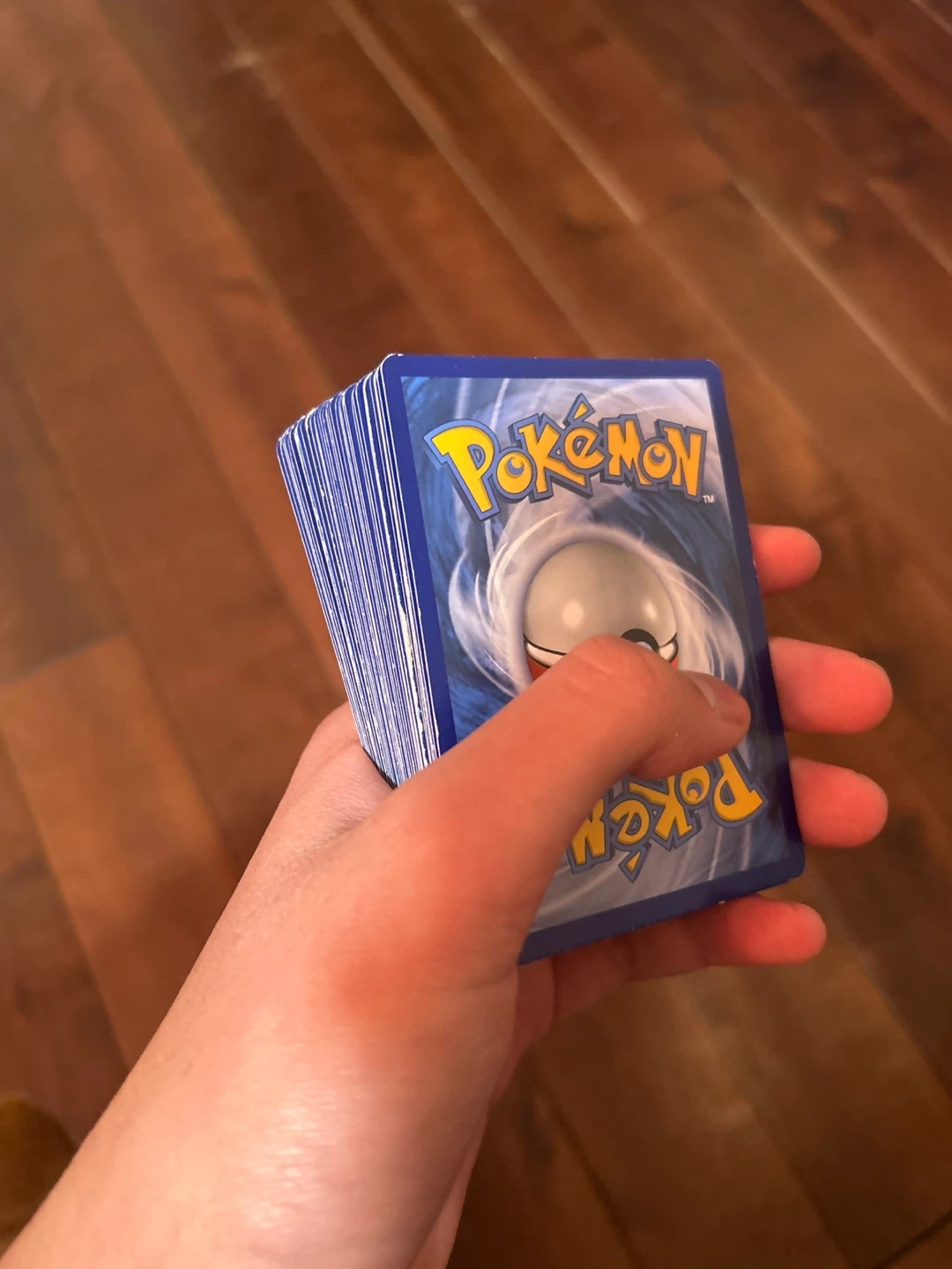 A stack of Pokemon trading cards. The back of the cards features the iconic Pokemon logo and design. These are standard trading cards for collectors and players.