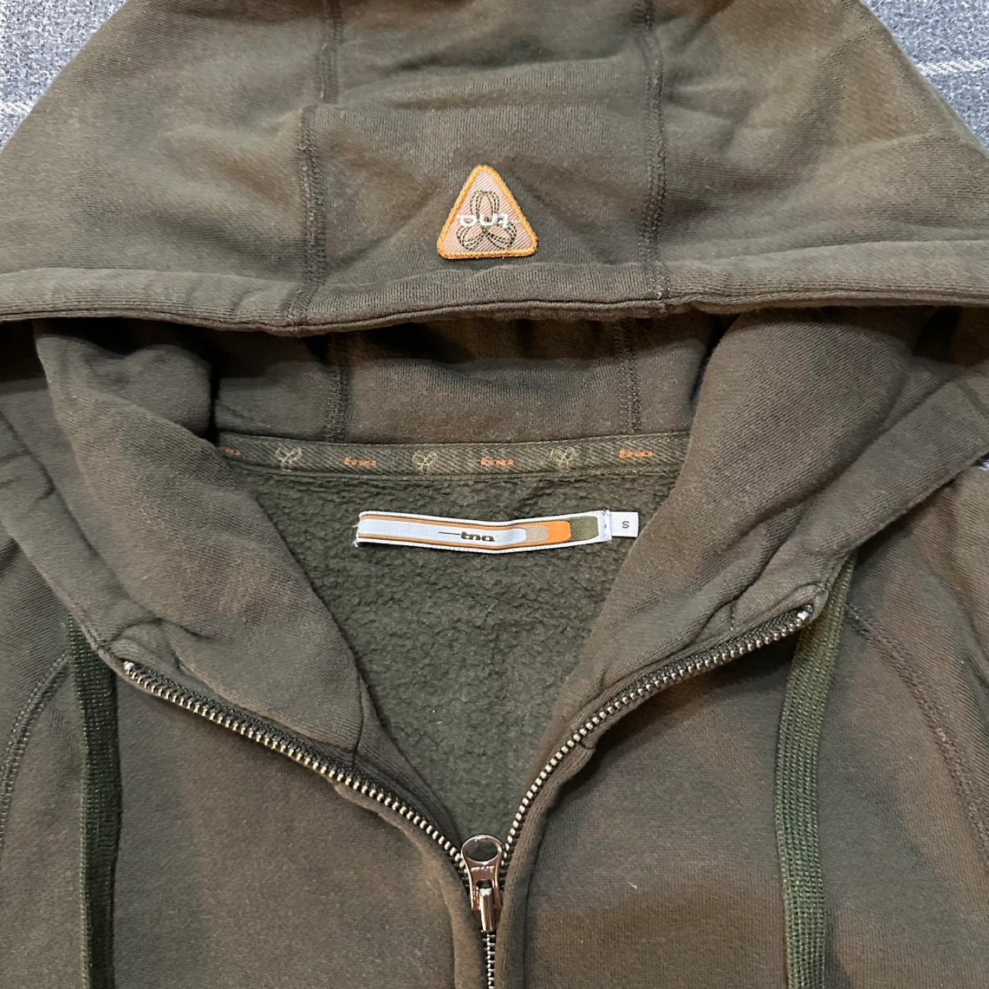 I'm selling a TNA zip-up hoodie in olive green. It's in great condition and a size small. Perfect for layering or wearing on its own!