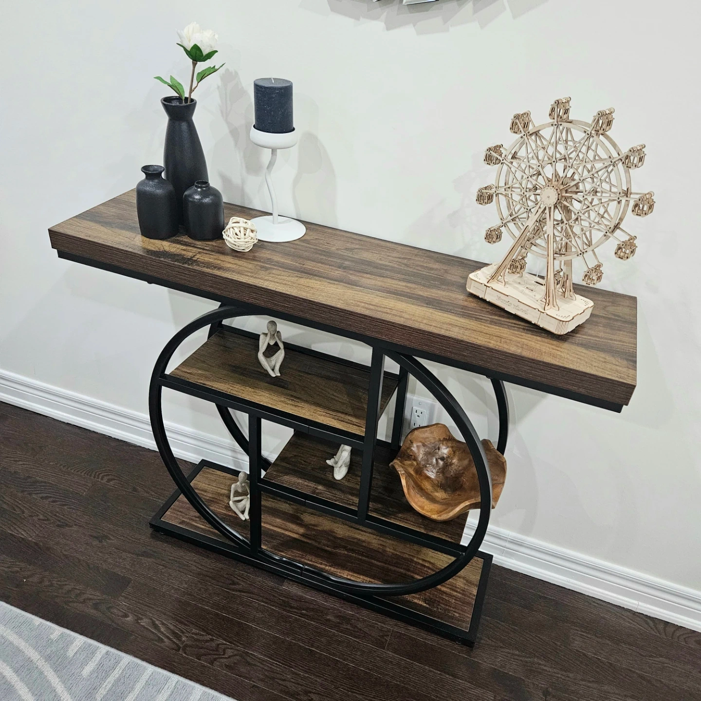 This console table features a dark wood-look top and shelving with a black metal frame. It has a unique circular and geometric design. The table has multiple shelves for storage or display.