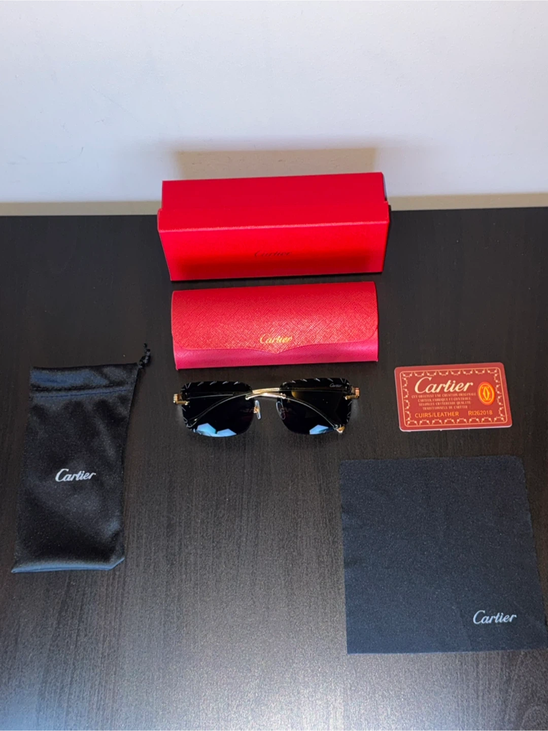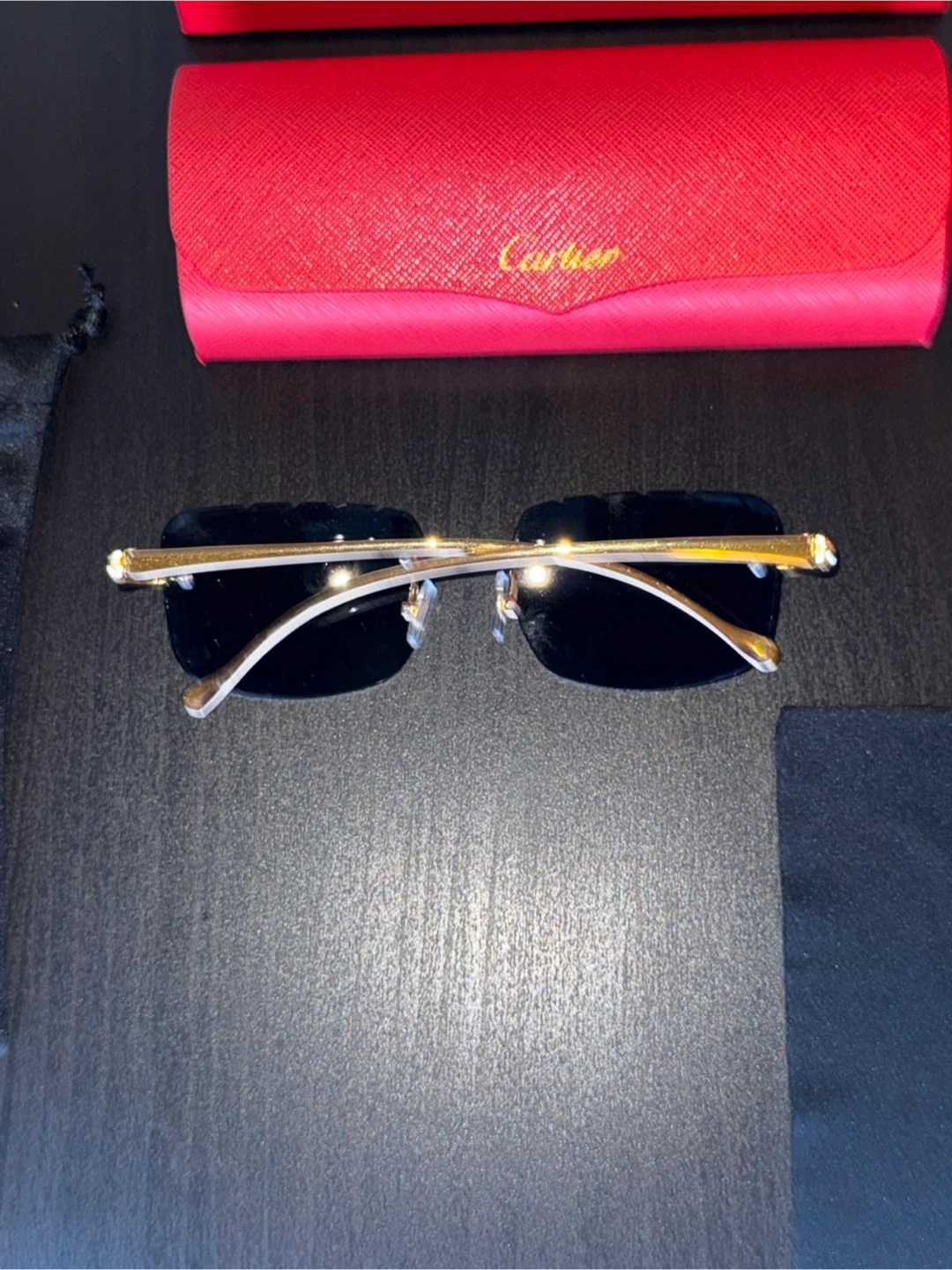 These are Cartier rimless sunglasses with black lenses. They come with the original red Cartier case, box, dust bag, and authenticity card. Gold-tone accents and detailing on the frame.