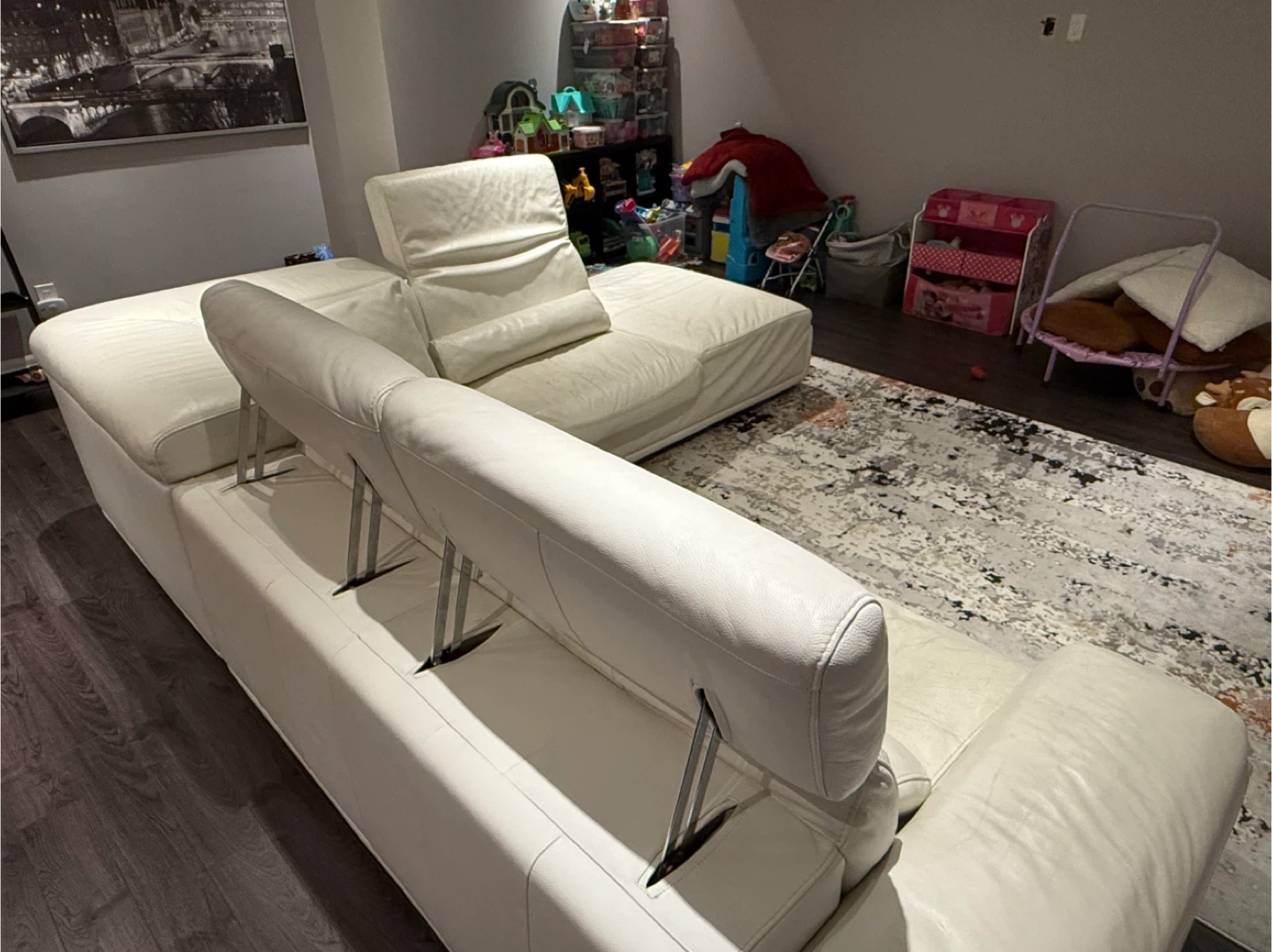 This spacious sectional sofa is upholstered in white leather. It features adjustable headrests for customized comfort. The chaise lounge provides extra seating and lounging space. It's perfect for a family room or basement!