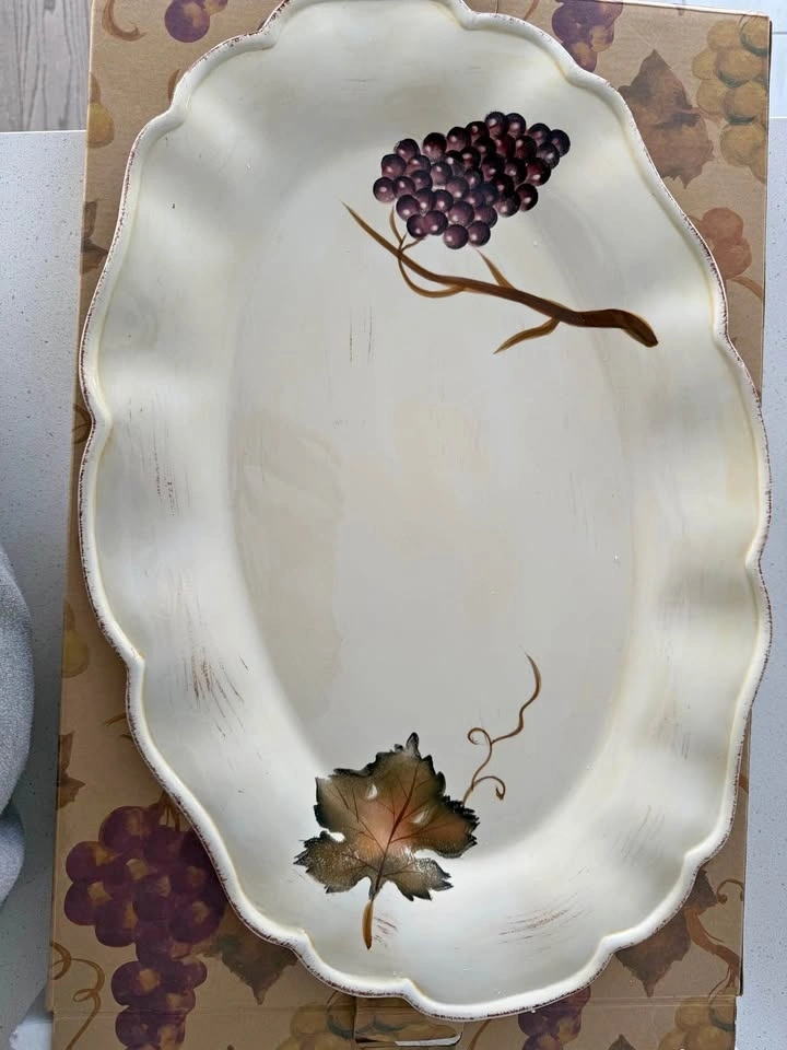 Large 21 inch oval platter. Hand painted grape design. Dishwasher safe, but not for microwave. Great for serving or just decor!
