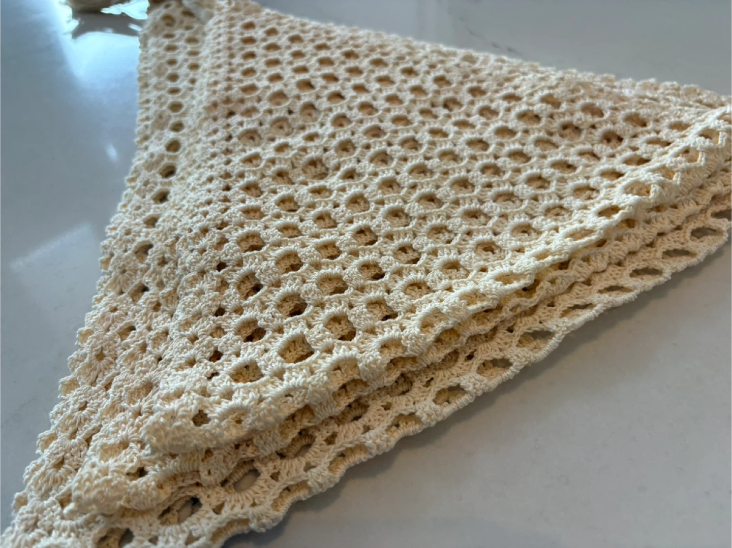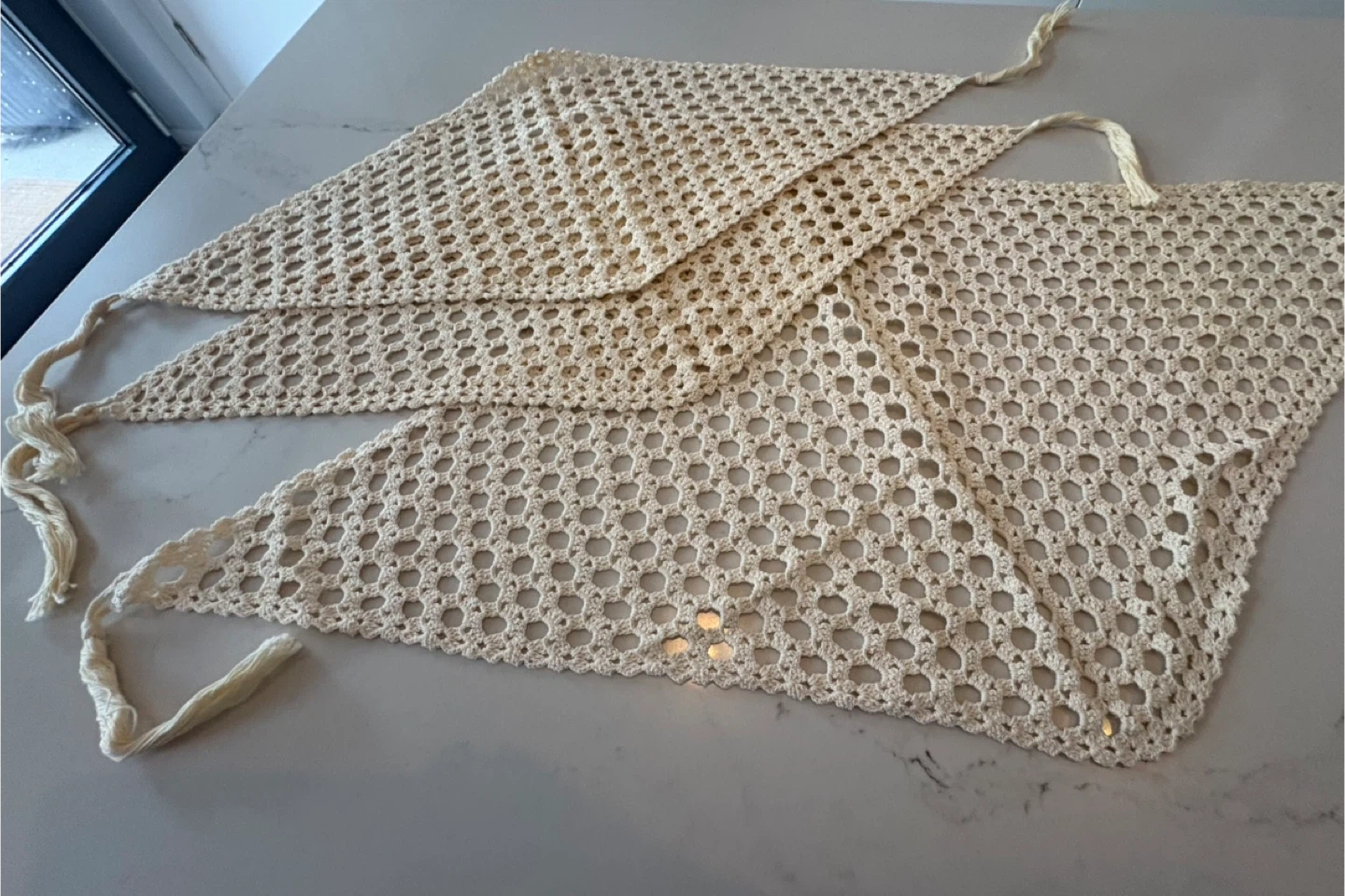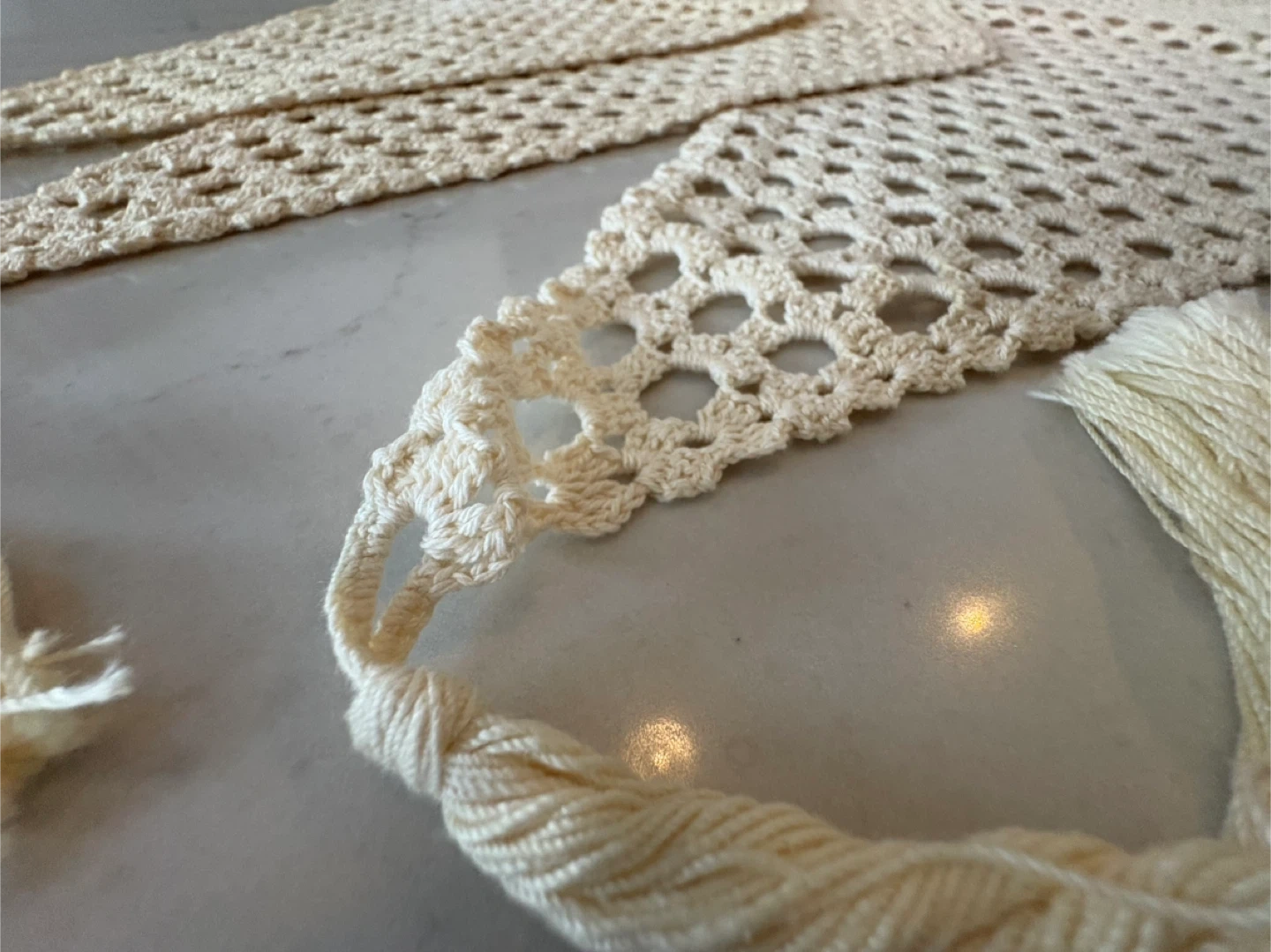 Charming vintage handmade ecru / buttery beige diamond shape crochet lace doilies or table runners with tassels - 3 piece set.