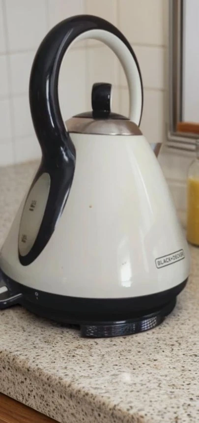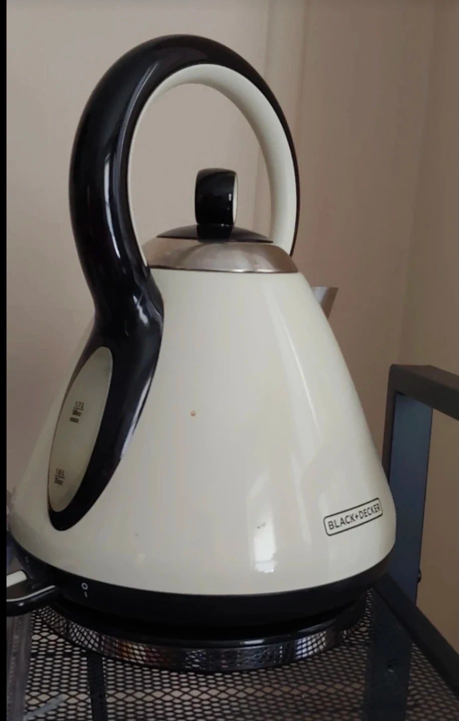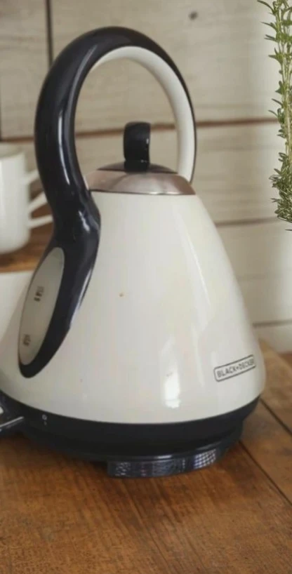 🥕This is a Black+Decker electric kettle. It's cream and black with a large handle. The capacity is 1.7 liters. It has a water level indicator. It's used but in great condition.