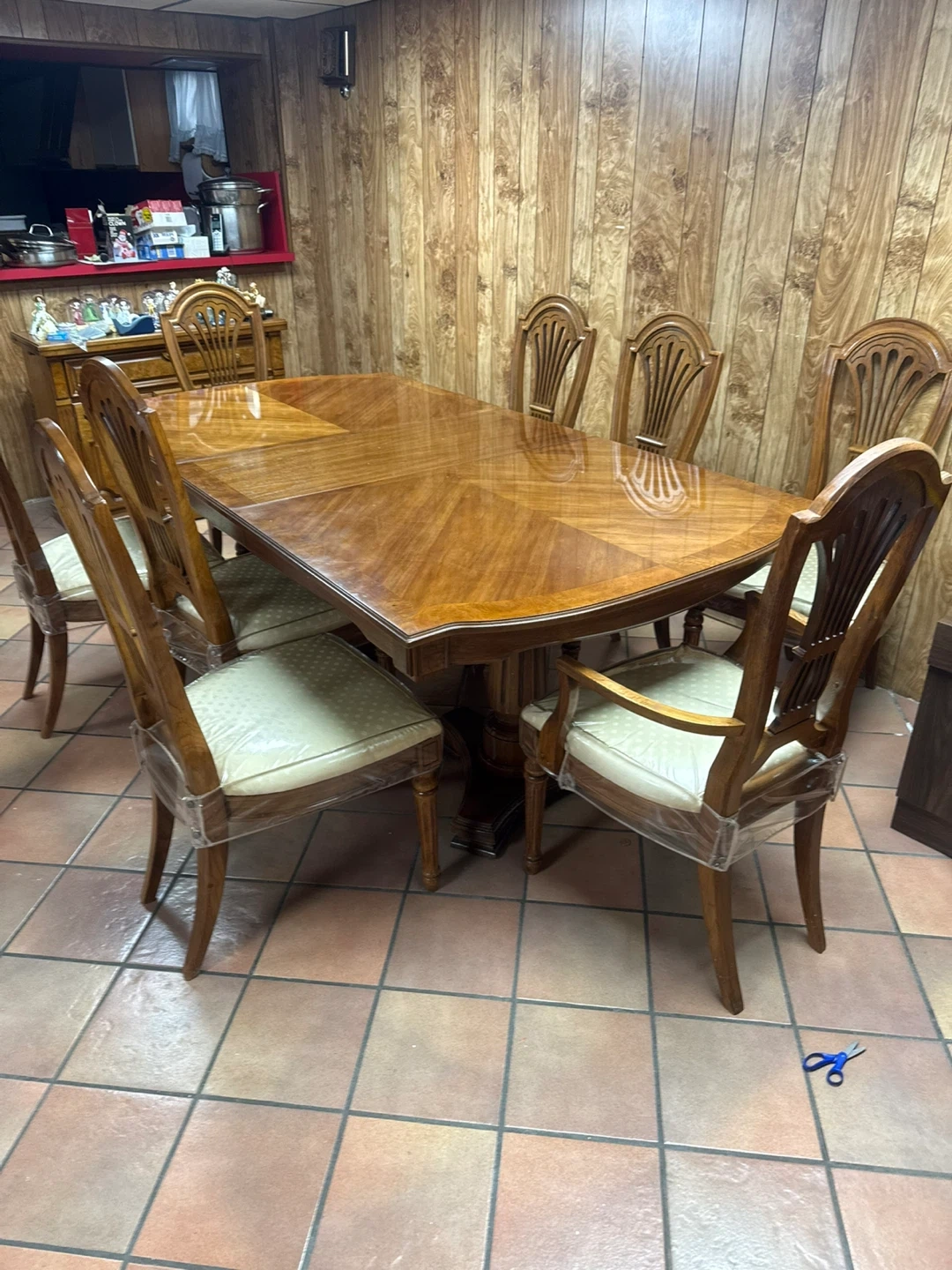 This dining room set includes an oak dining table with 8 cushioned chairs, a china cabinet, and a server buffet. The set is perfect for seating 8 people and has a total of 11 items. Made of oak, this set is perfect for hosting large family dinners or holiday gatherings. The China cabinet provides ample storage space for dishes, while the server buffet offers additional seating and storage for serving food.