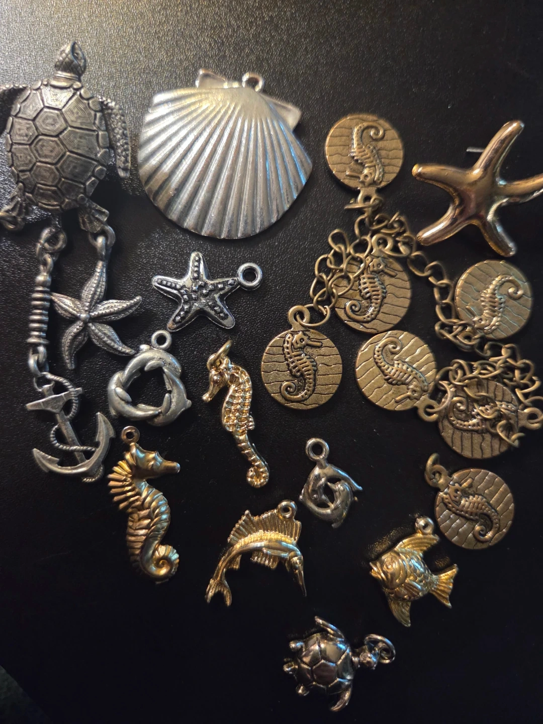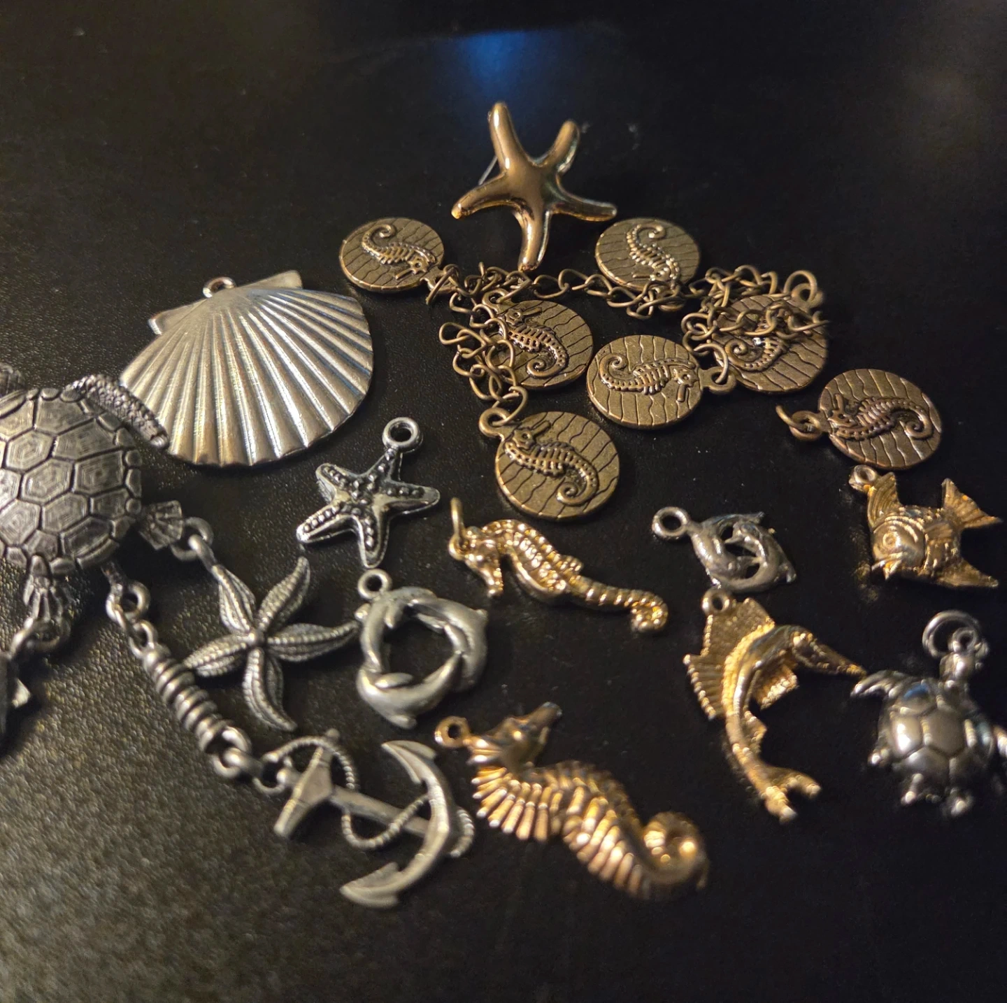 Collection of various metal charms with nautical themes, including seahorses, sea turtles, fish, starfish, shells and anchors. Charms are made from mixed metals with gold and silver tones. Perfect for crafting or adding to bracelets and necklaces!