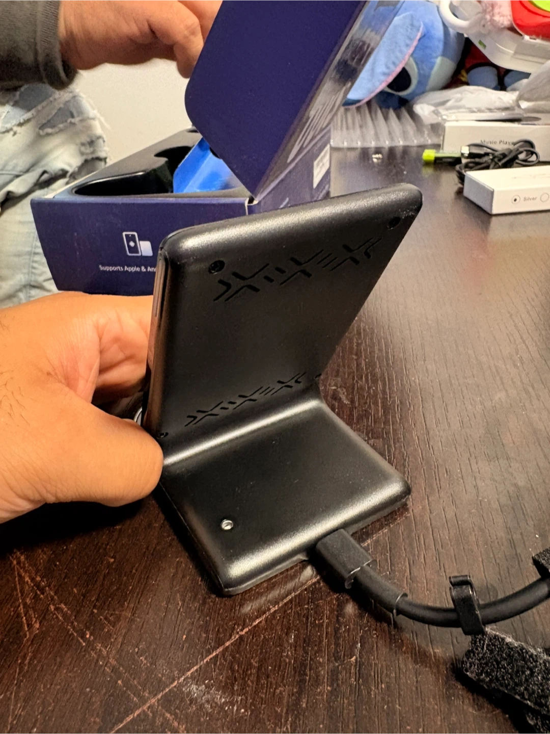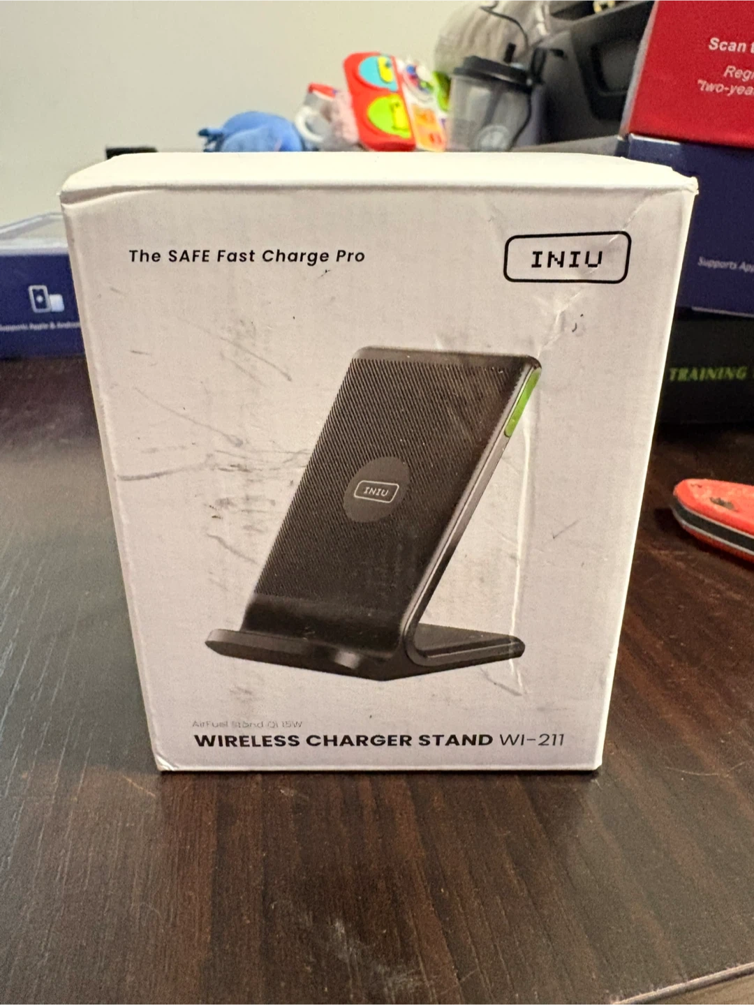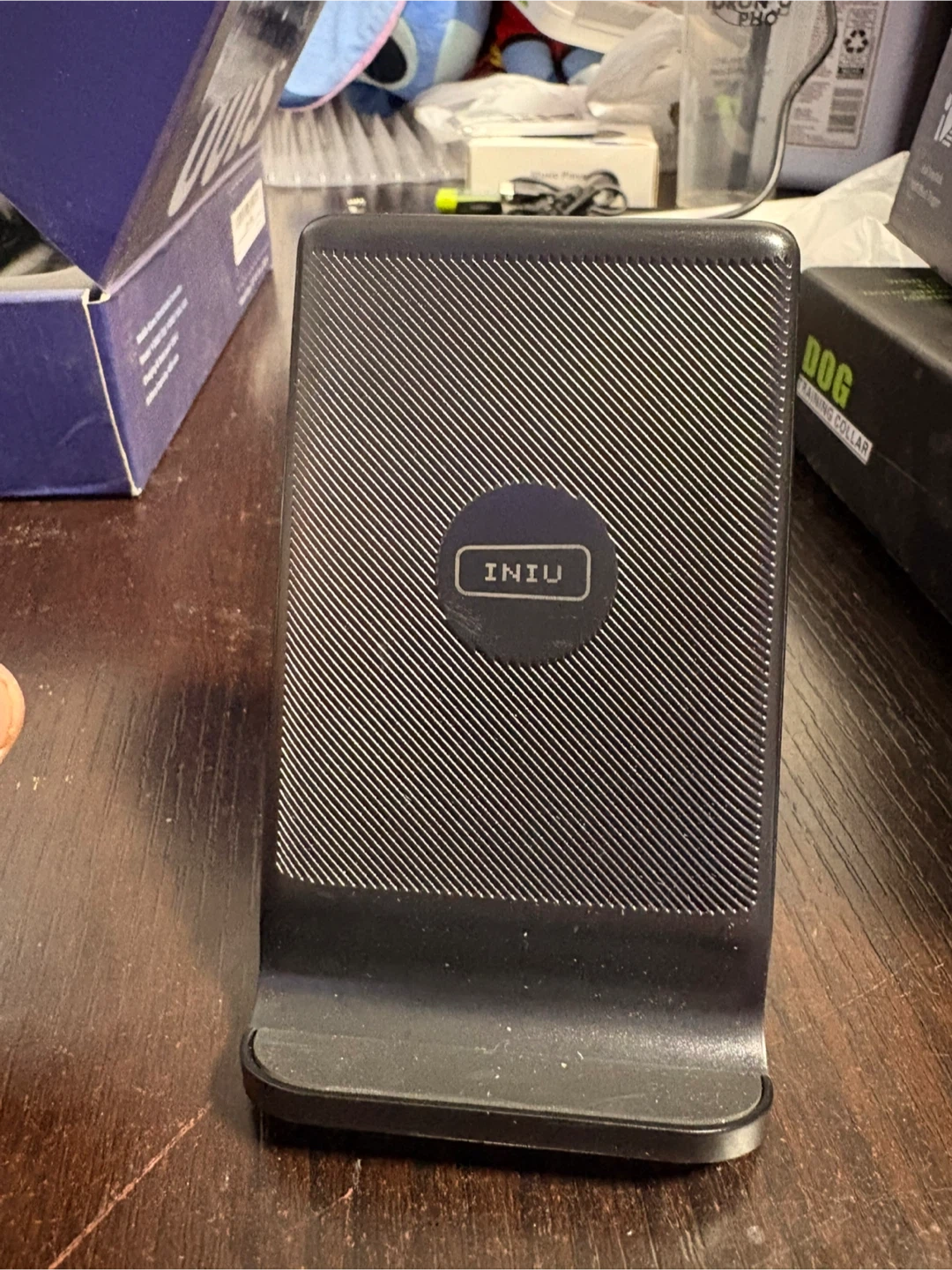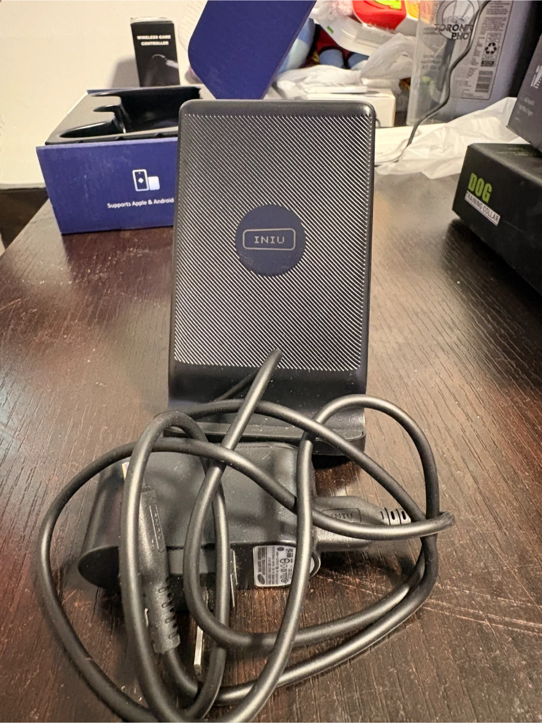 This is the INIU Wireless Charger Stand, model WI-211. It supports Apple and Android devices. It's black and comes with a charging cable. This charger offers 15W fast wireless charging.