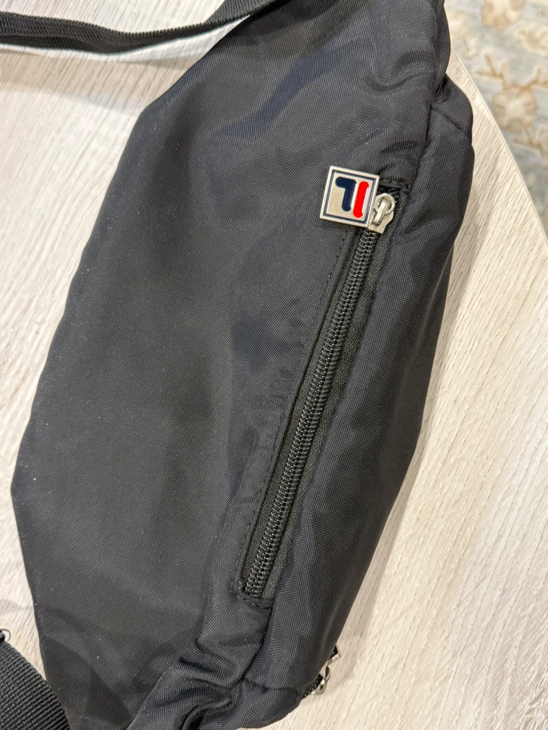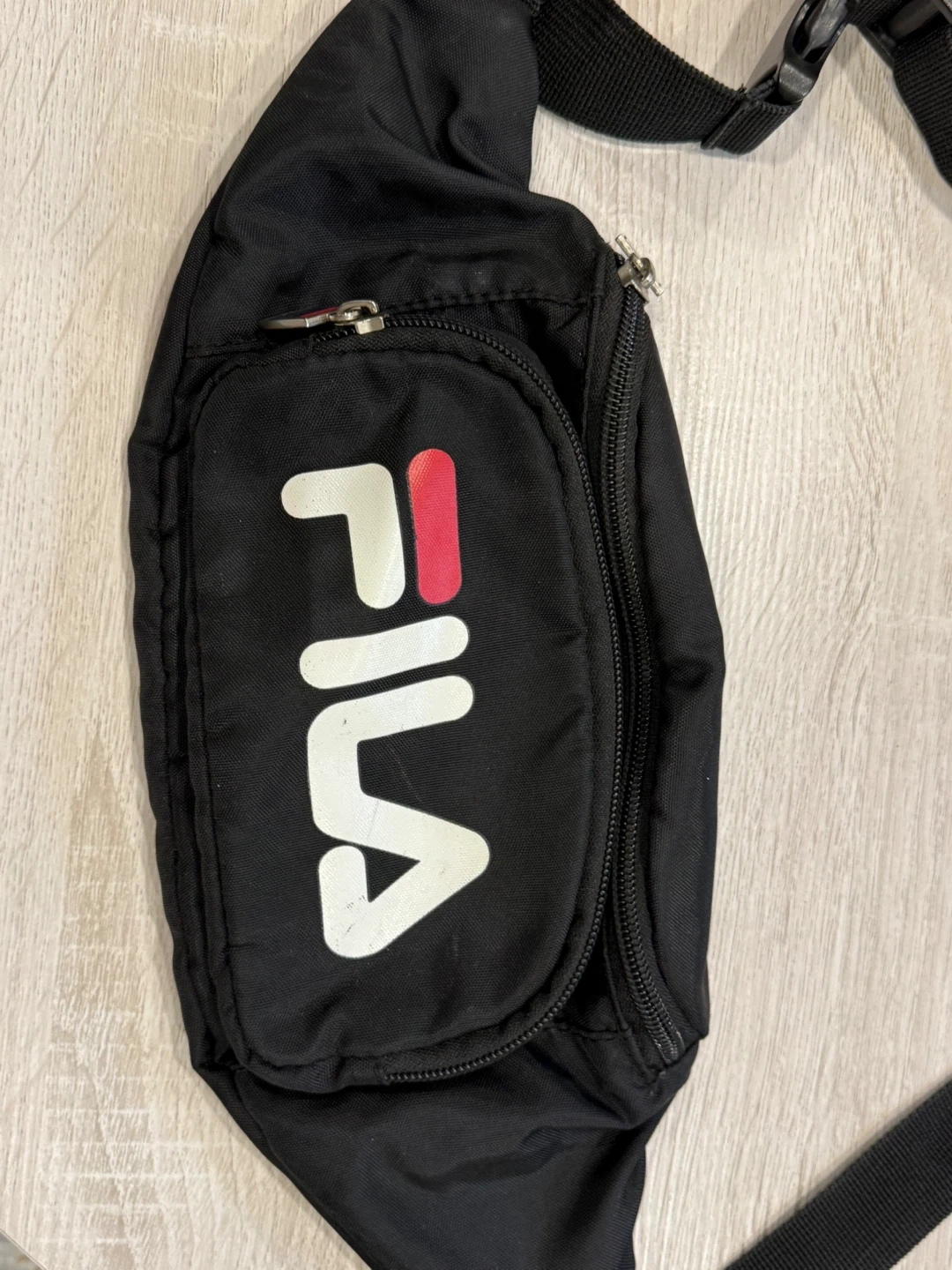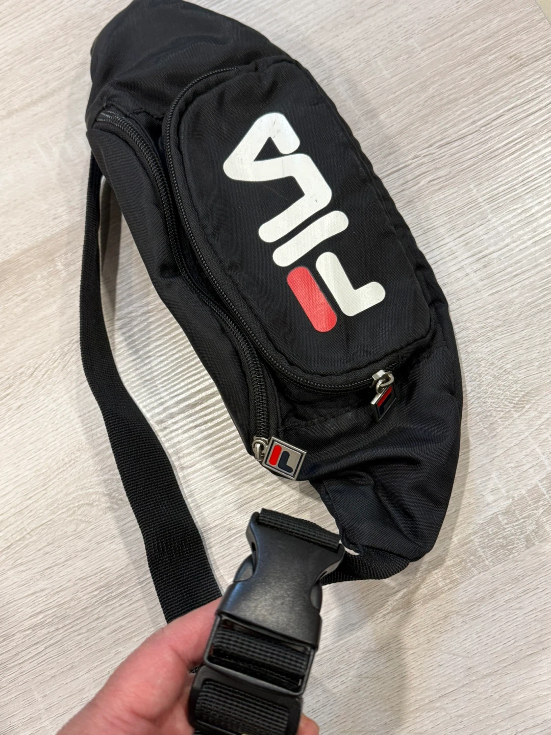 This is a black fanny pack from Fila. It's made of durable material and features a prominent Fila logo. The adjustable strap has a secure buckle. It's great for carrying essentials while on the go!