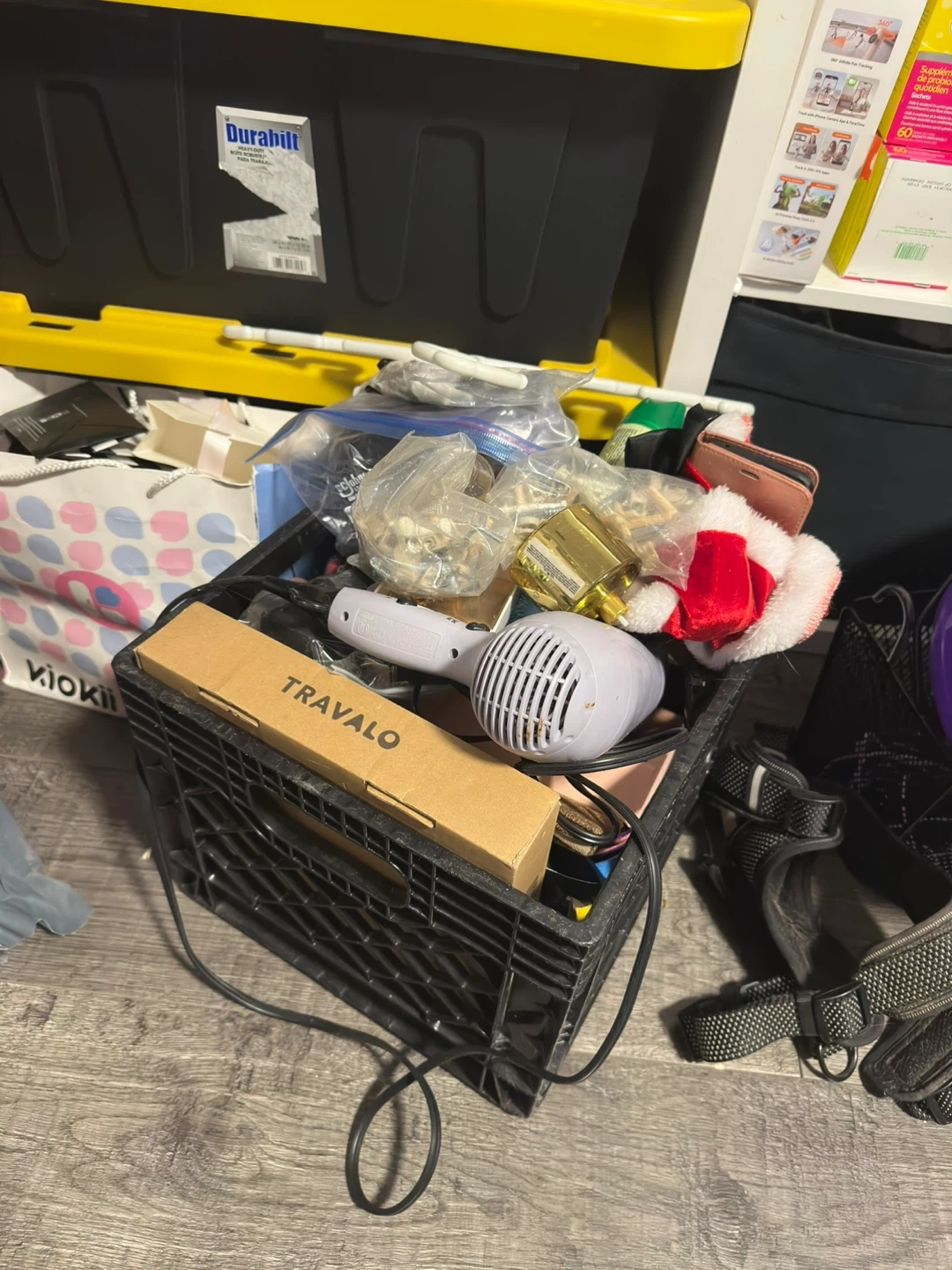 I'm getting rid of this cage of things: household items, perfumes, mosquito spray, phone case, cat/dog clothes, hair dryer and more