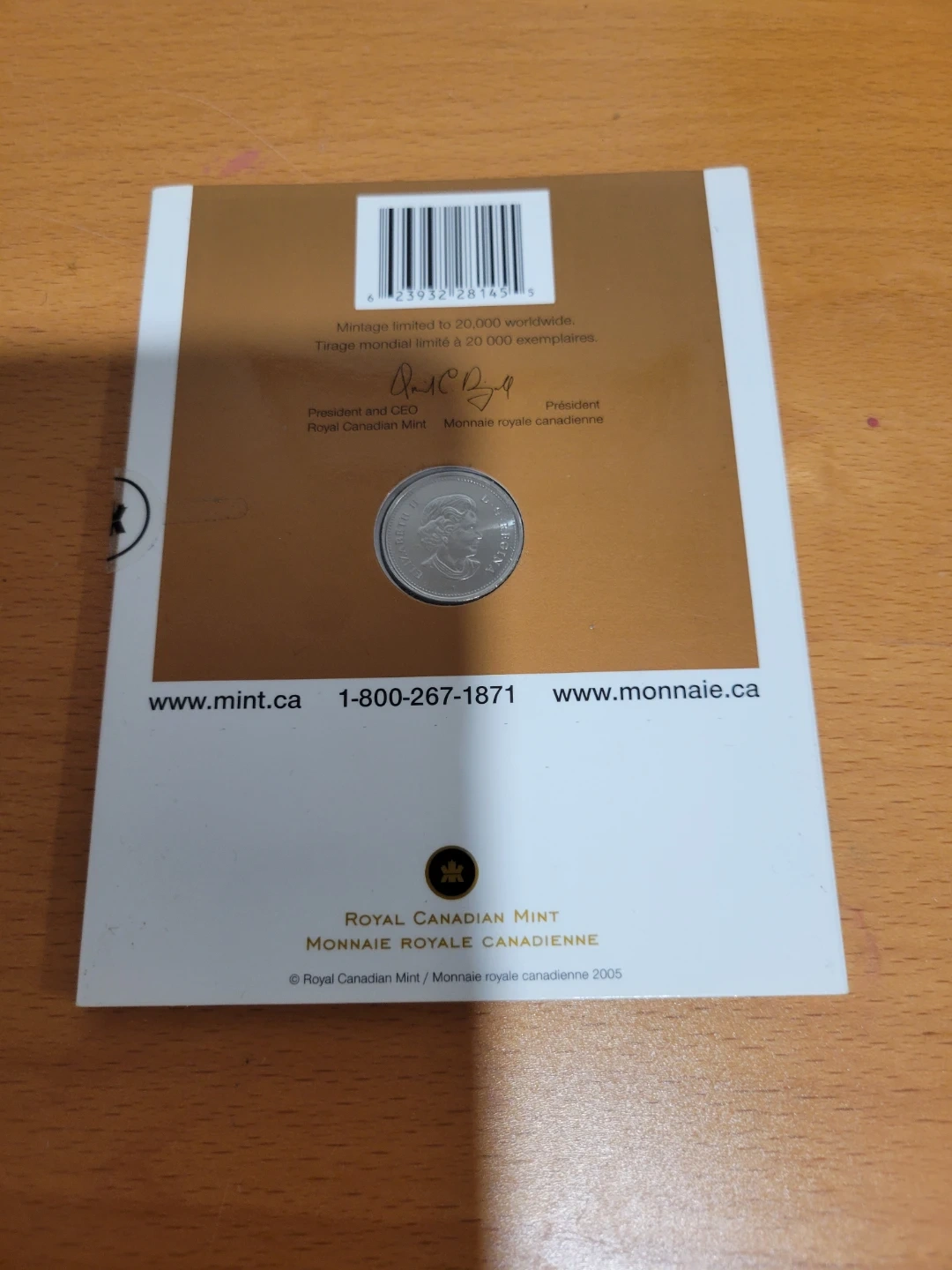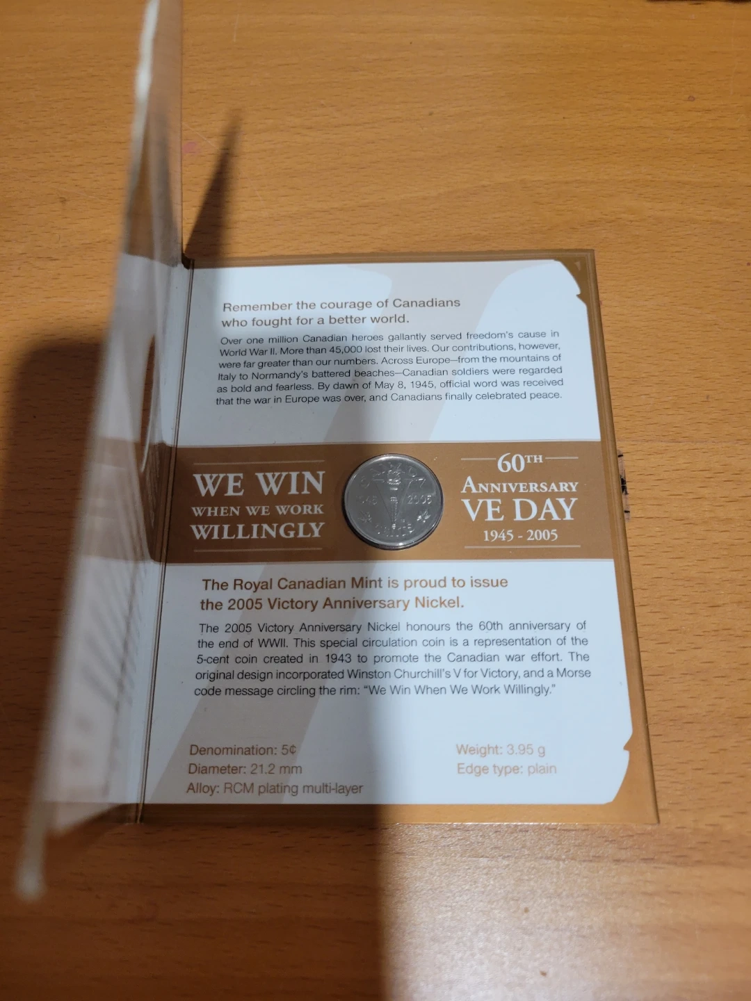 This is the 2005 Victory Anniversary Nickel, commemorating the 60th anniversary of the end of WWII. It features Winston Churchill's V for Victory design and the Morse code message 'We Win When We Work Willingly'. Denomination: 5¢. Diameter: 21.2 mm. Weight: 3.95 g.