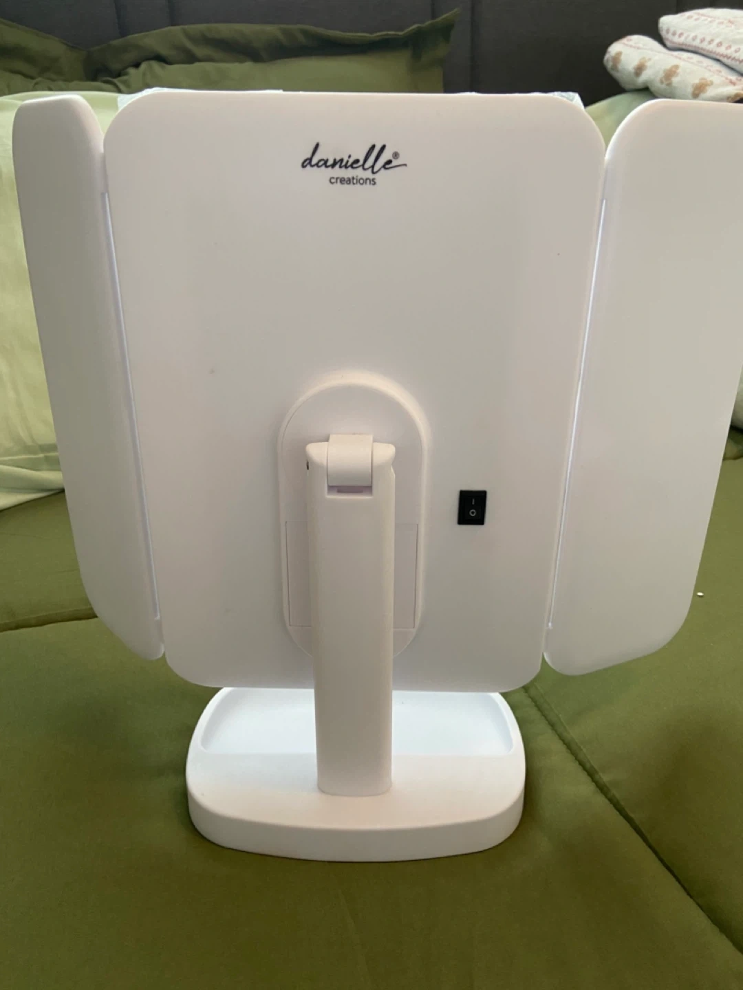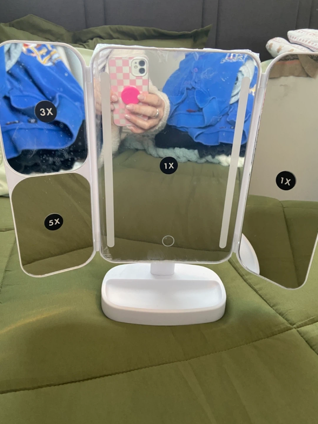 This Danielle Creations tri-fold mirror has LED lights for clear makeup application. It offers 1X, 3X, and 5X magnification options. A handy tray at the base holds small accessories.