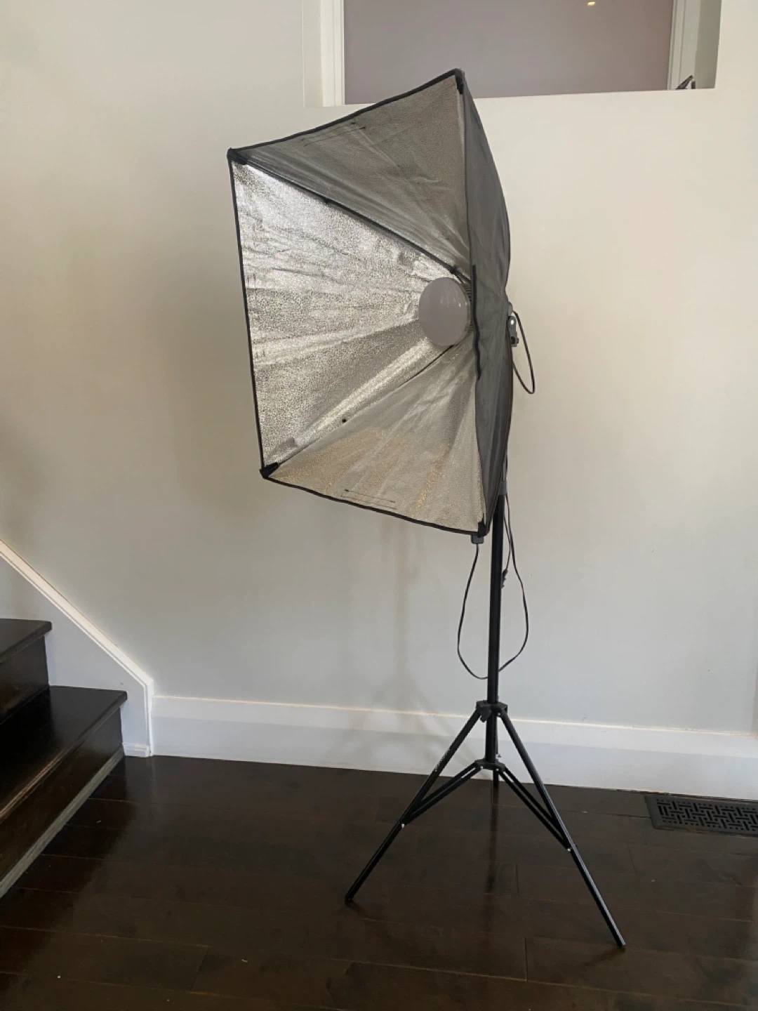 This Neewer softbox lighting kit includes 2 Umbrella Softbox with two light bulbs 5500k and a background stand.