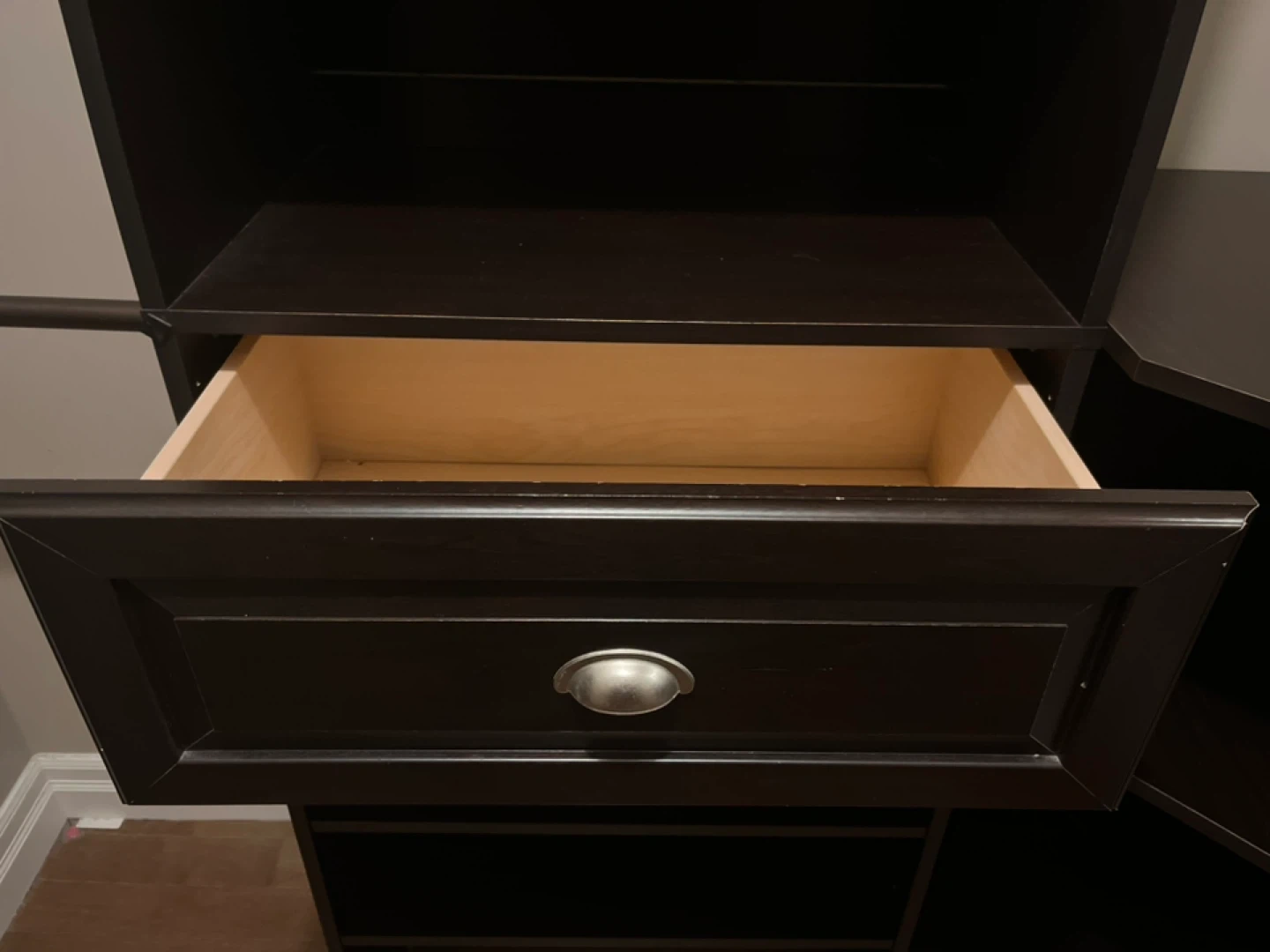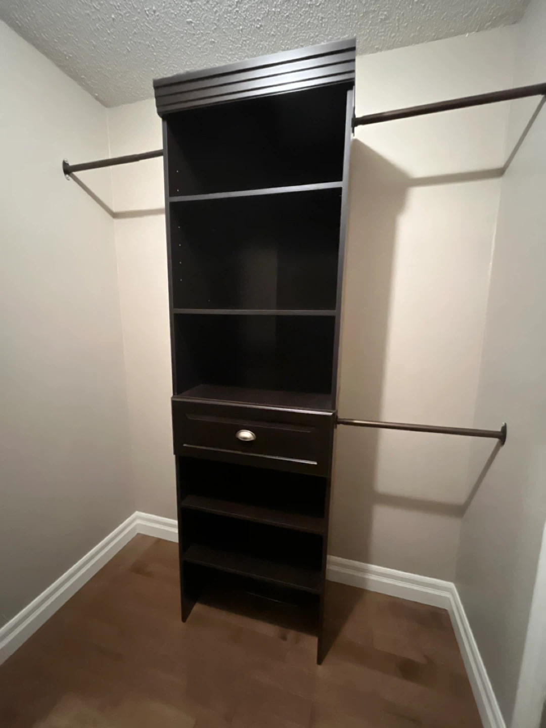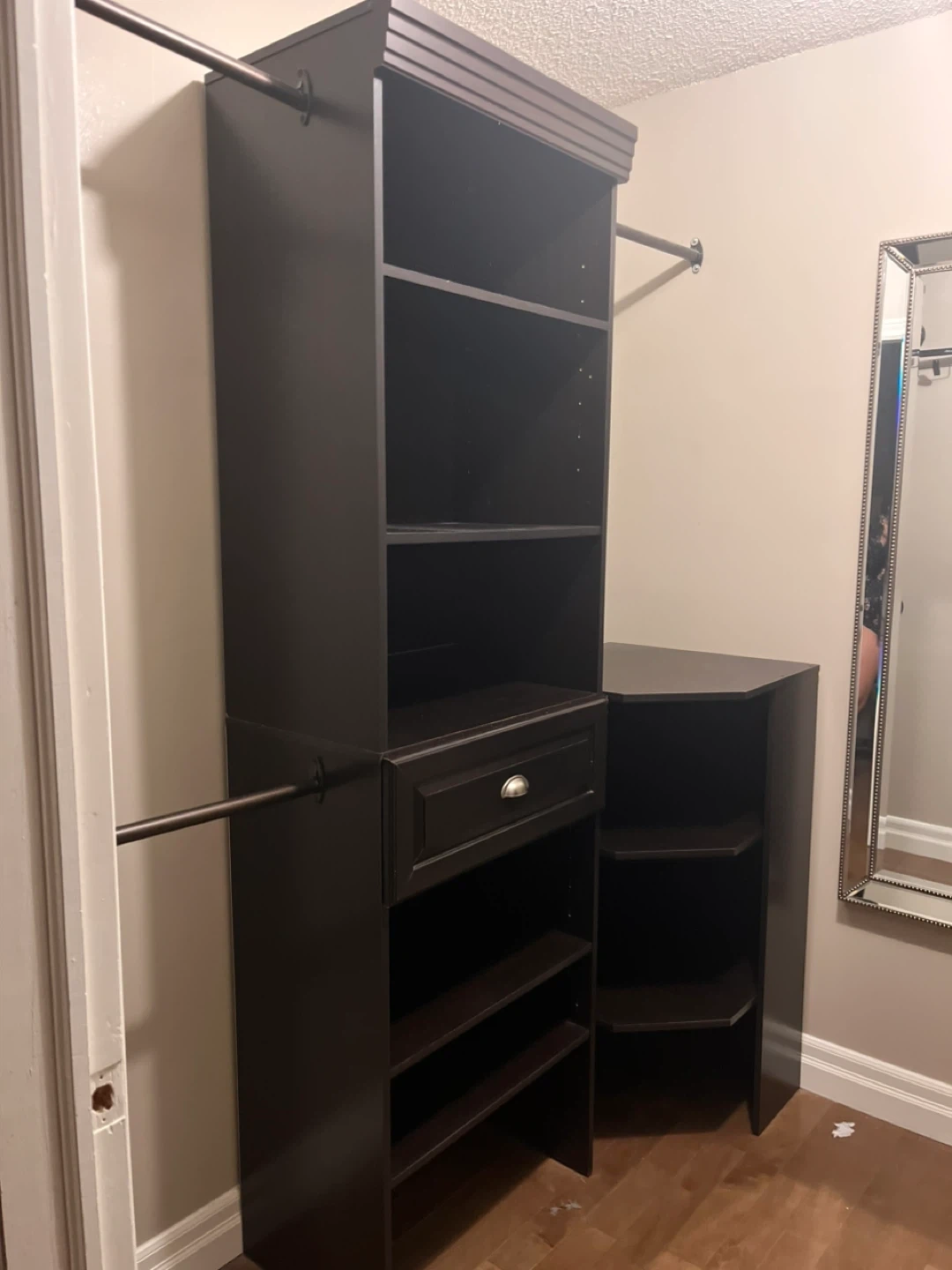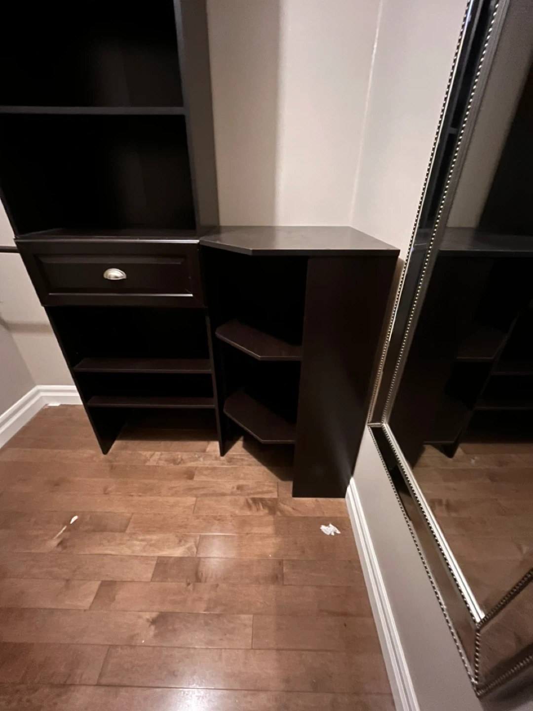 Two dark brown closet organizer unit with multiple shelves and a single drawer. Includes 2 corner shelving unit. Multi purpose. Endless configuration possibilities. MDF. Very sturdy. No chips.