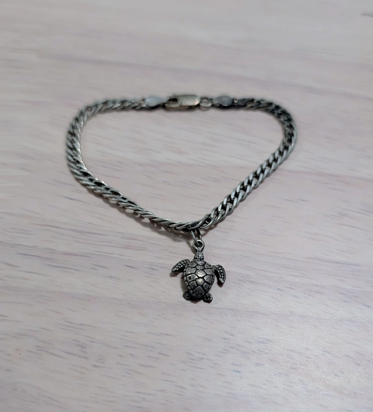 A delicate silver bracelet with a detailed turtle charm. It features a sturdy clasp and a braided chain design. This bracelet adds a unique touch to any outfit.