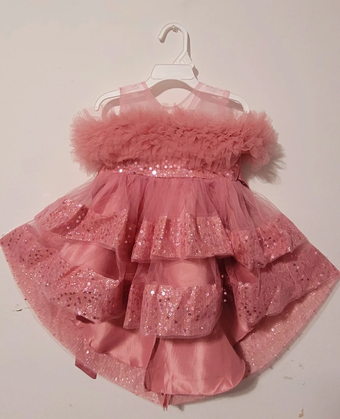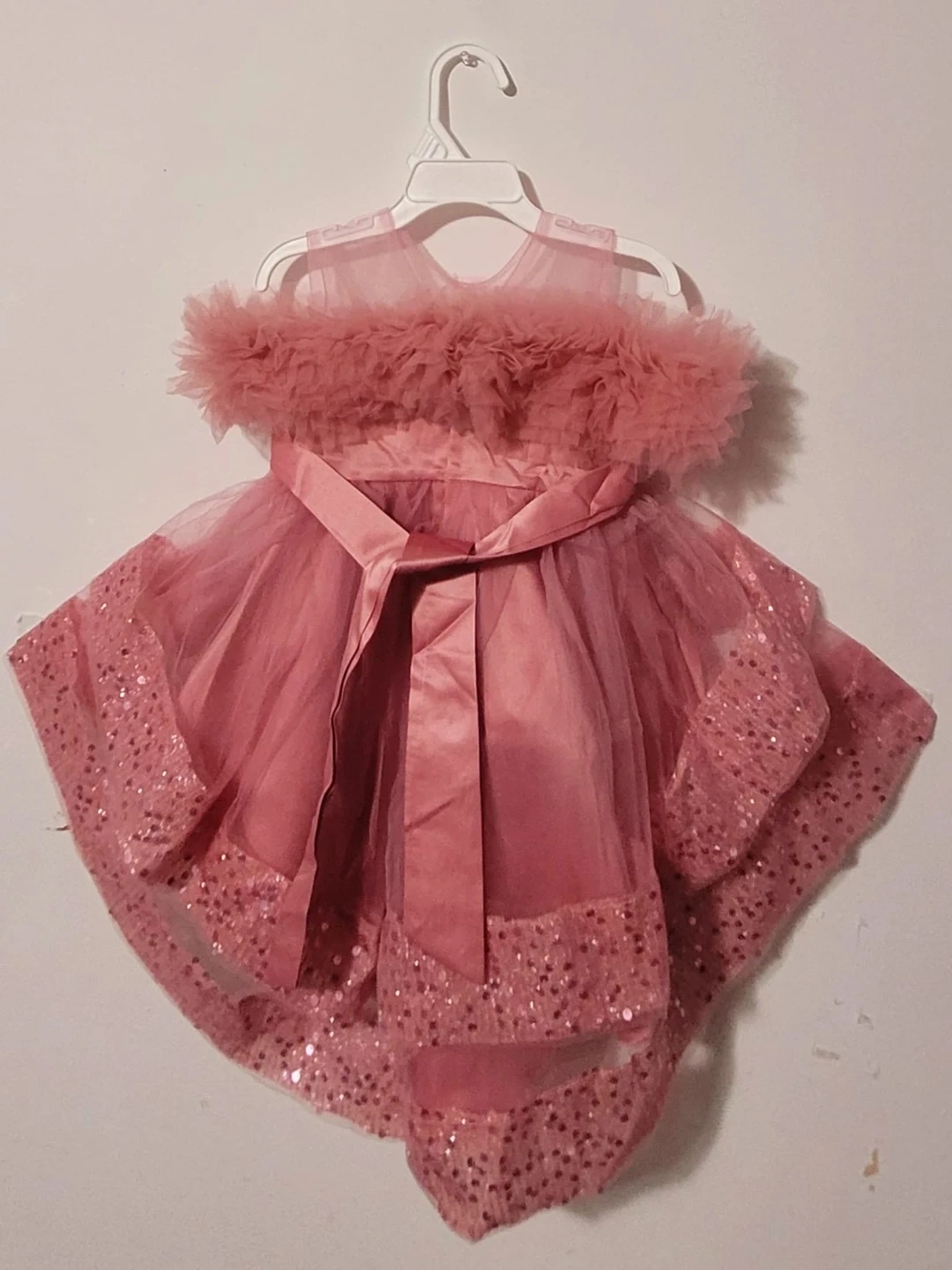 Beautiful pink dress with layered tulle and sequin details. Features a satin sash and a fuzzy neckline. Perfect for special occasions!