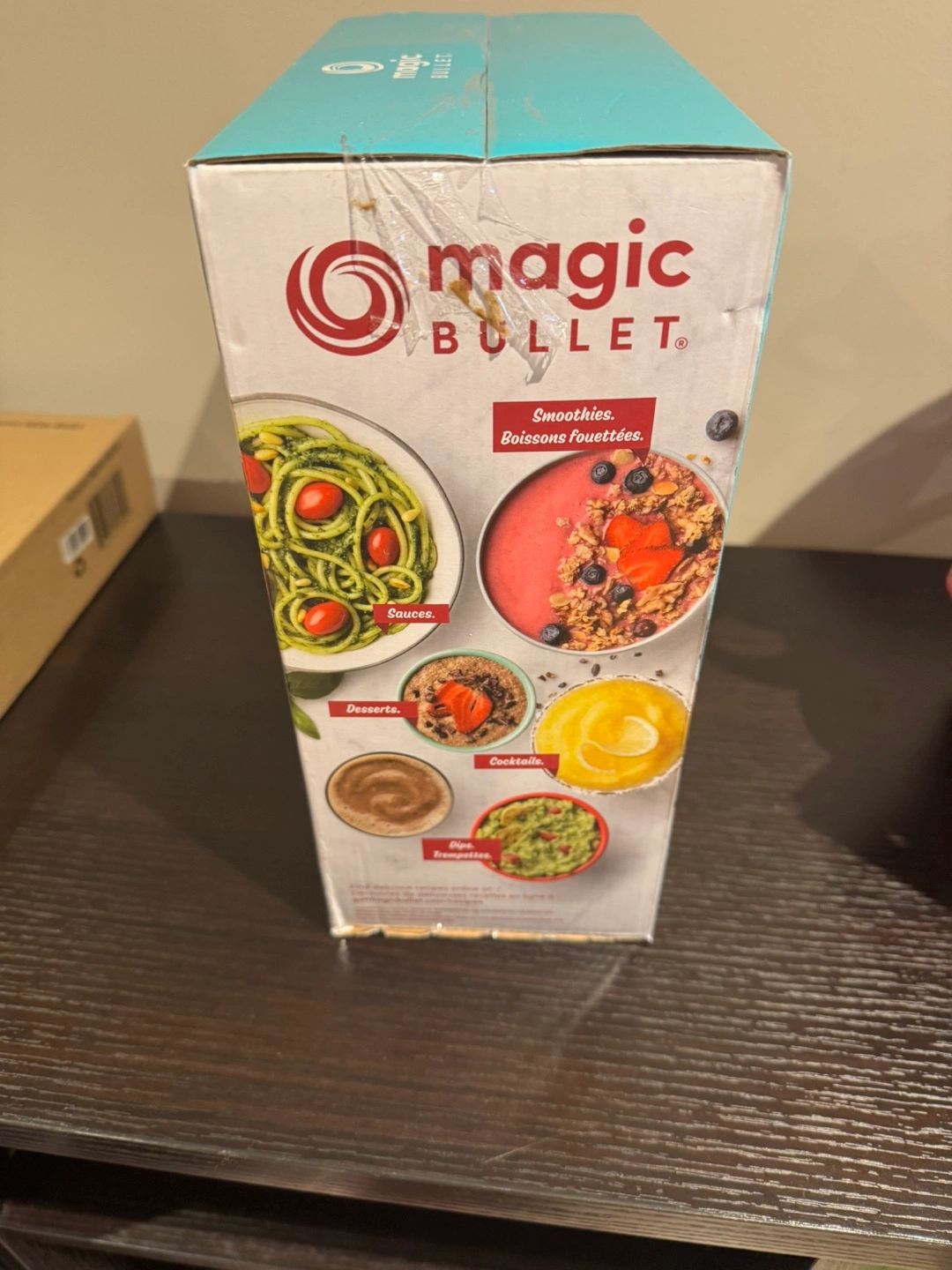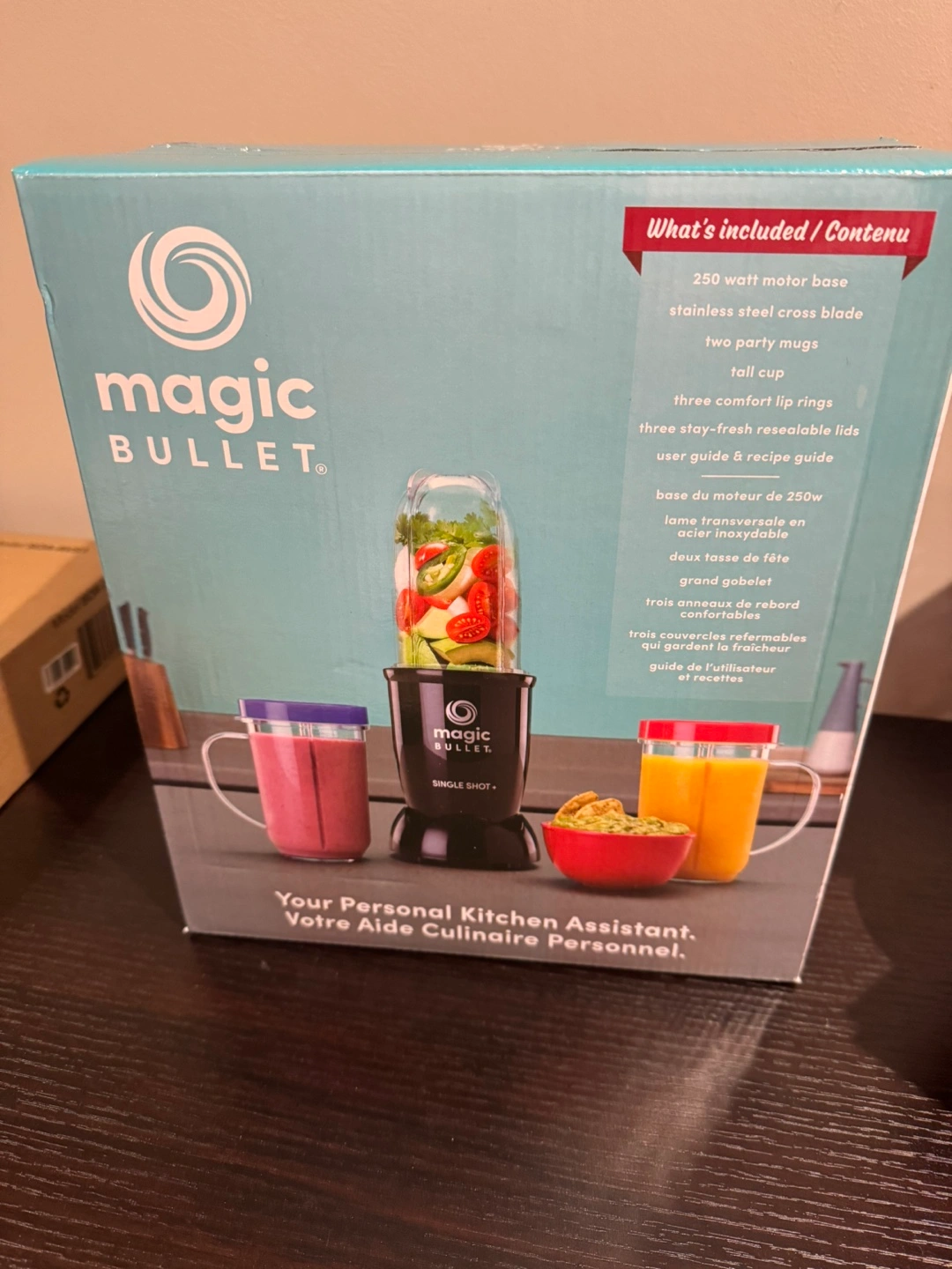 New, in box. 250-watt motor base, stainless steel cross blade, tall cup, two party mugs, three stay-fresh resealable lids, user guide & recipe guide.