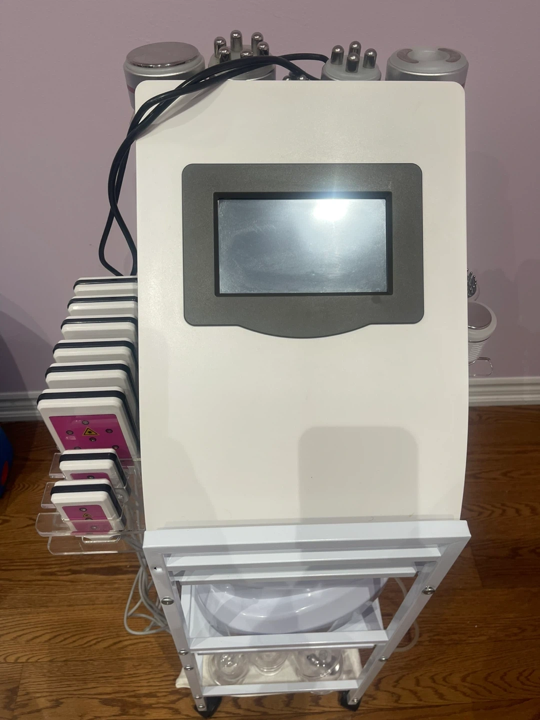 This is a beauty slimming machine with multiple handpieces and a display screen. It comes with various attachments for different treatment needs. This machine is suitable for spa or salon use. Gently used only for about a month.