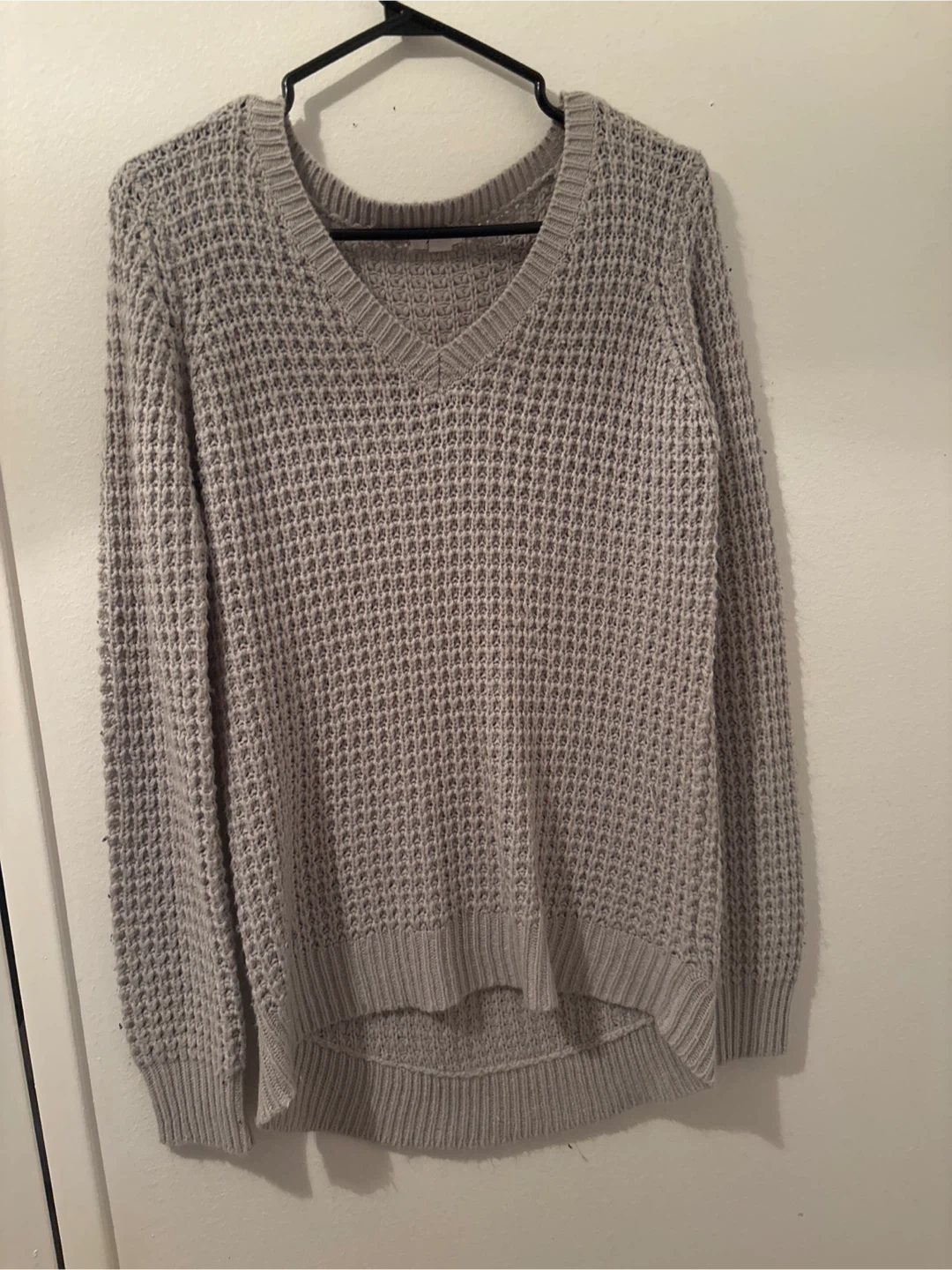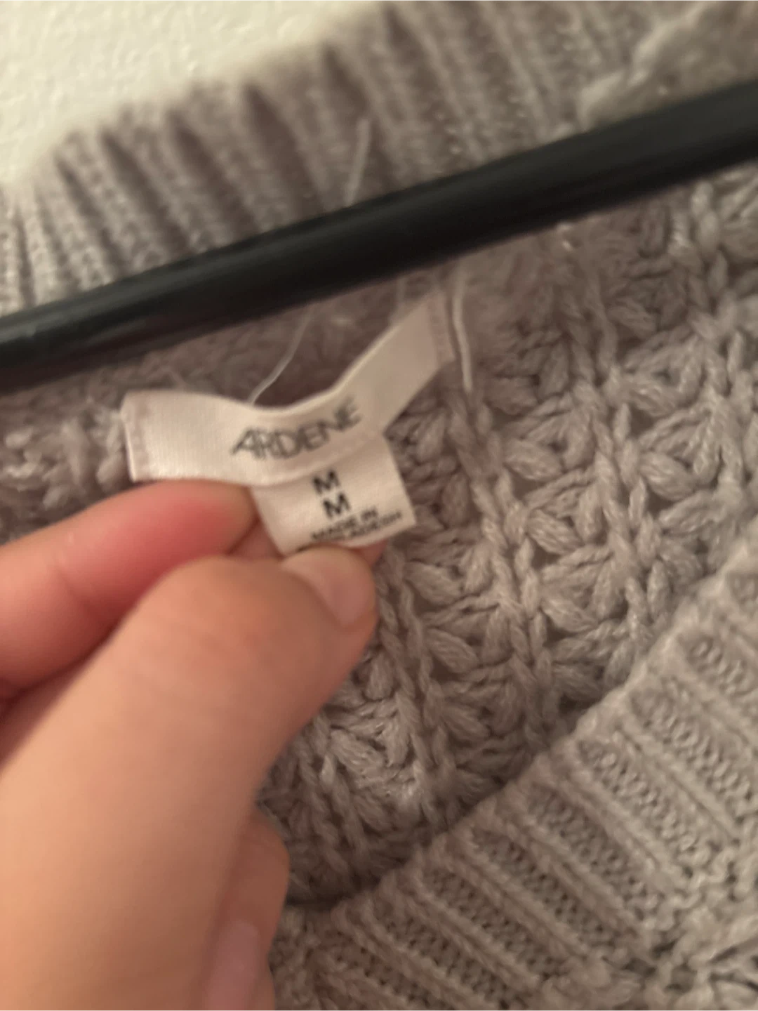 A cozy grey knit sweater from Ardenne. It's a size medium with a V-neck design and waffle knit texture. The material is soft and suitable for cooler weather.