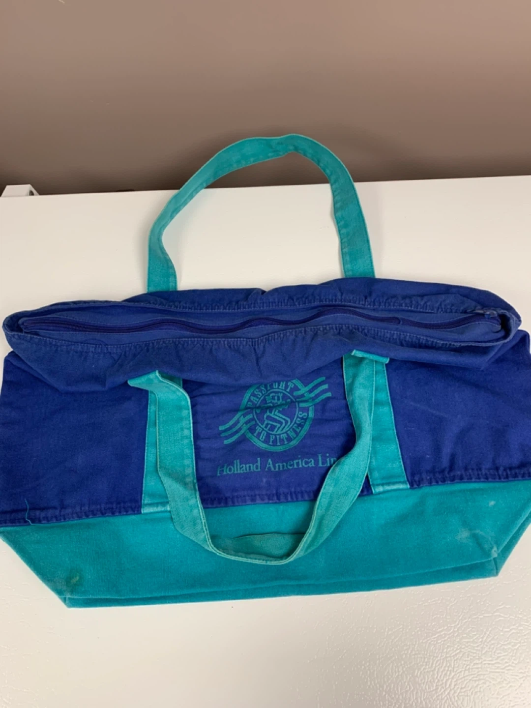 Canvas duffel bag with two handles and a zippered top. Features "Passport to Fitness" logo and "Holland America Line" text. Blue with teal accents. It has a front pocket.
