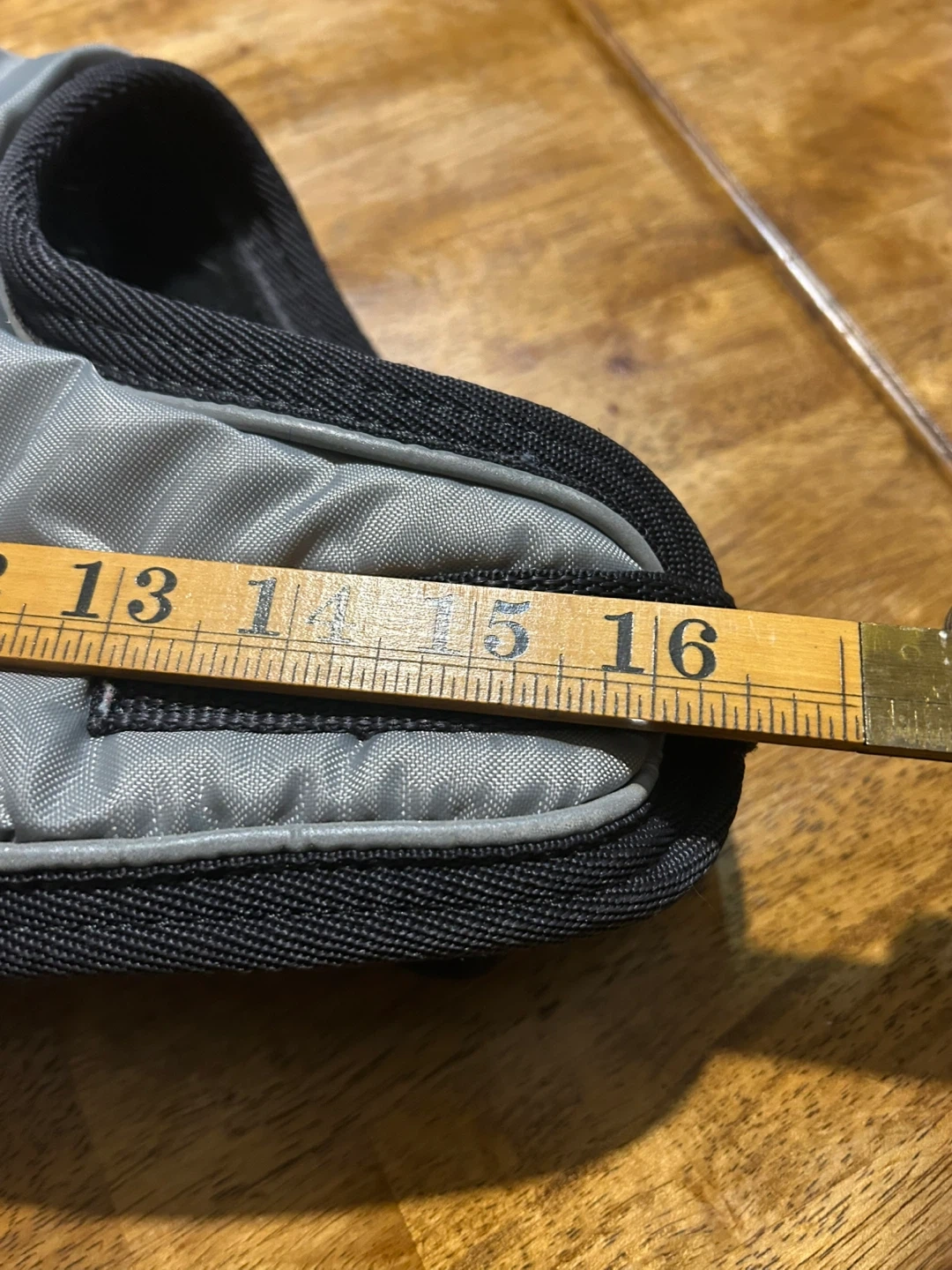 Grey dog winter vest with black trim. Made of nylon material. Chest measures approximately 16 inches and length is about 6 inches.