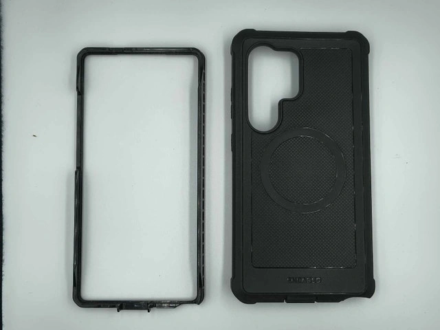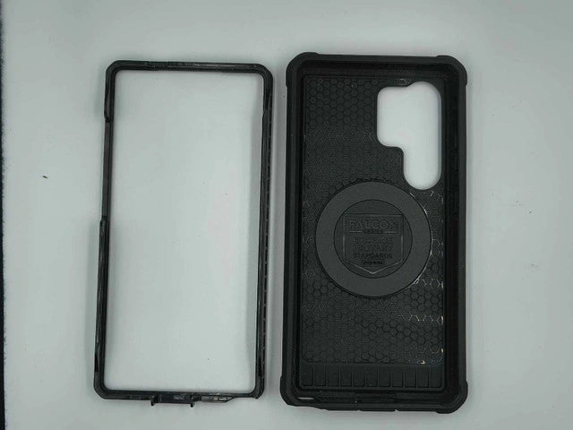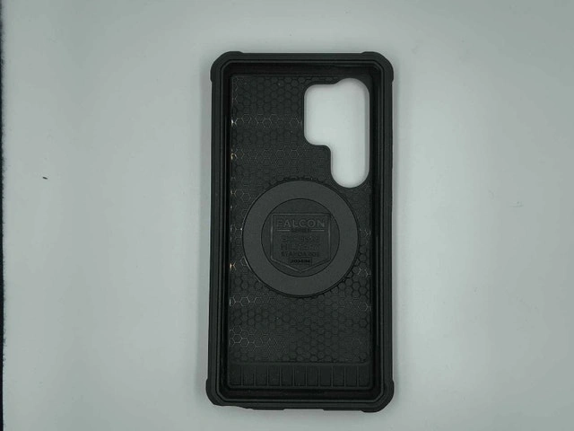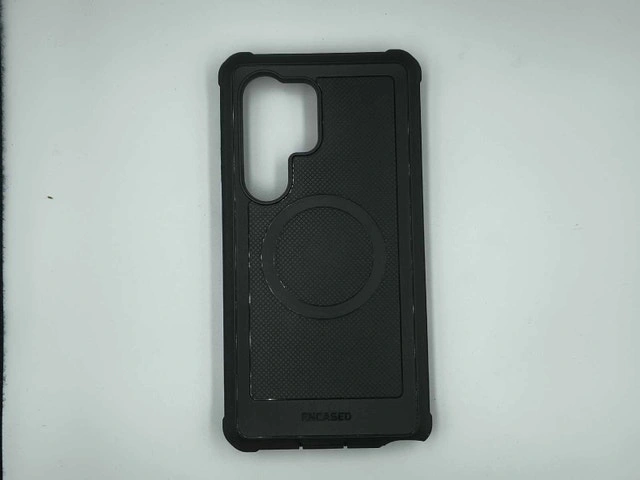 This rugged black Encased Falcon Series phone case is designed for the Samsung S25 Ultra, providing robust protection. It features a built-in MagSafe compatible ring for easy attachment to magnetic accessories. This was a seldom used item and includes a tempered glass screen protector. If the ad is still up, then yes, it's still available!