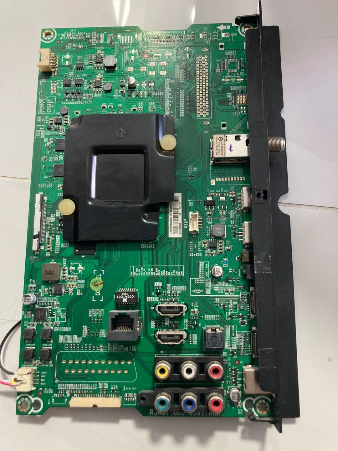This is a TV mainboard identified with the part number RSAG7.820.6591/ROH. It features RCA component and composite inputs, along with HDMI and Ethernet ports. It also includes a CI slot for additional modules.