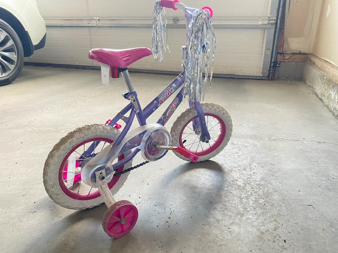 This is a kids' training bike, perfect for a beginner rider. It's purple with pink accents, including the seat and handlebar grips. Comes with sparkly streamers on the handlebars and training wheels.