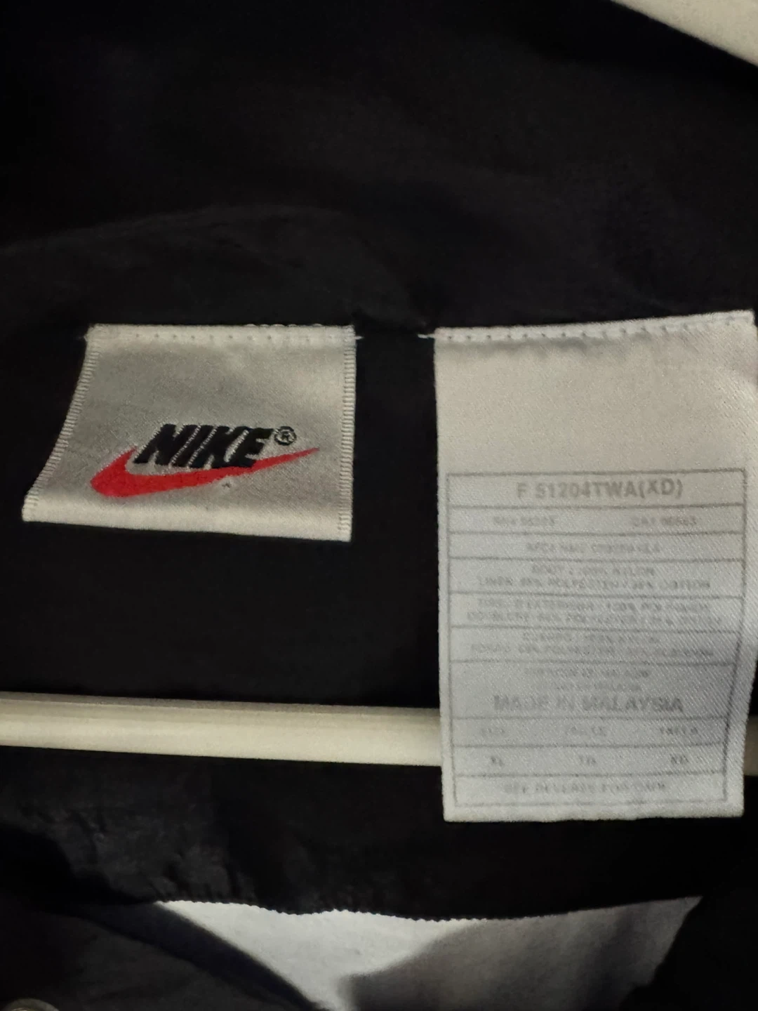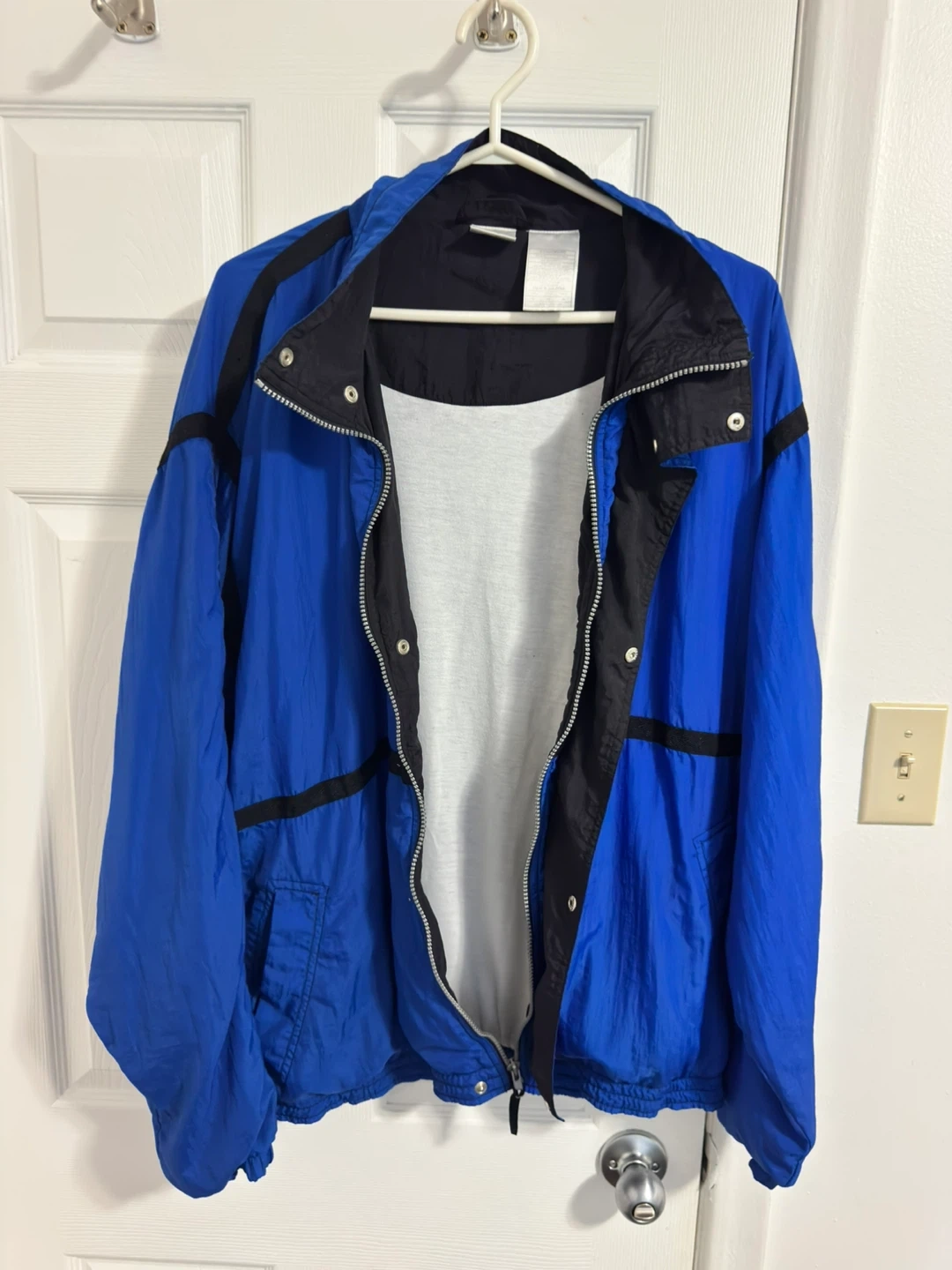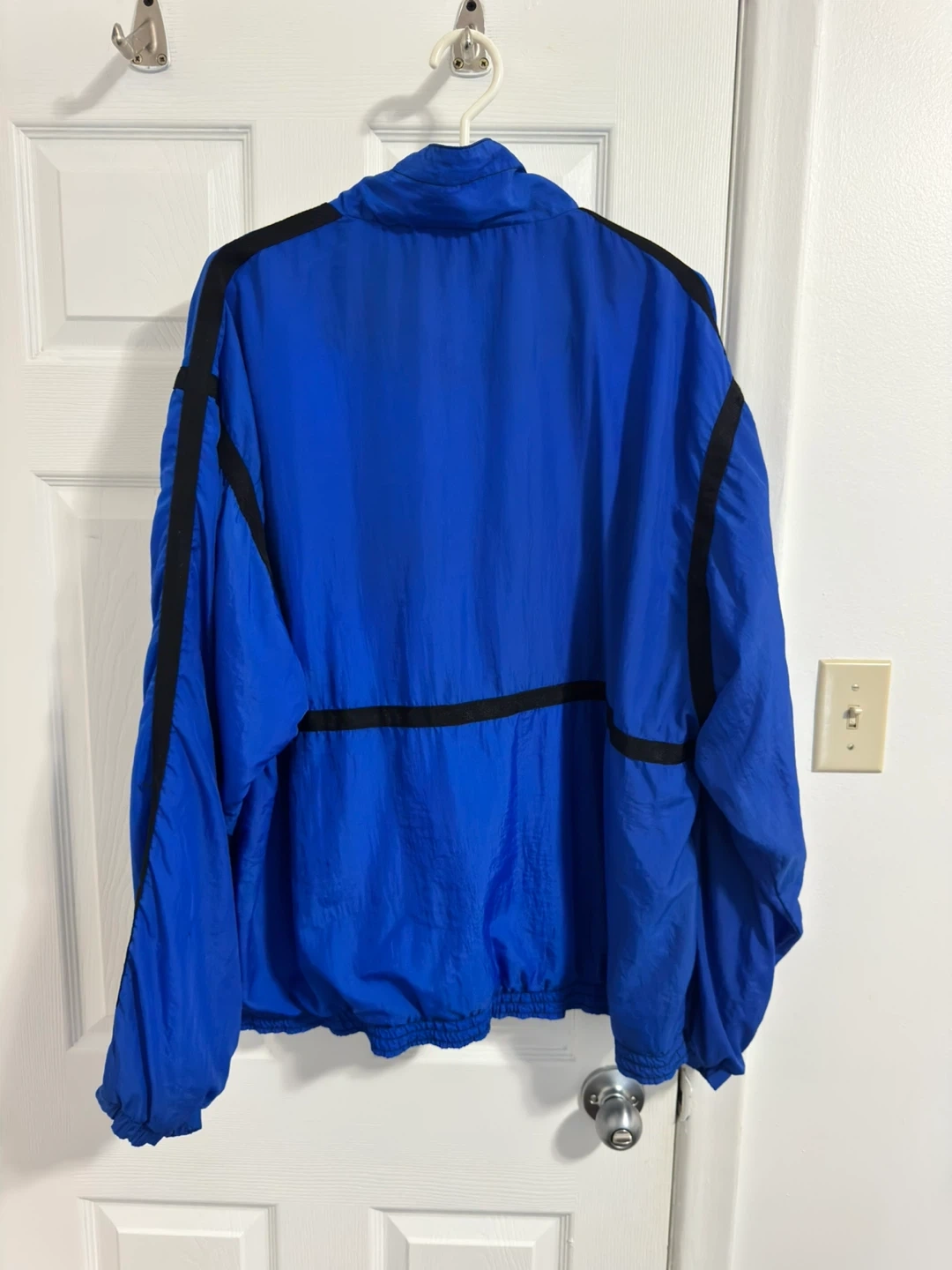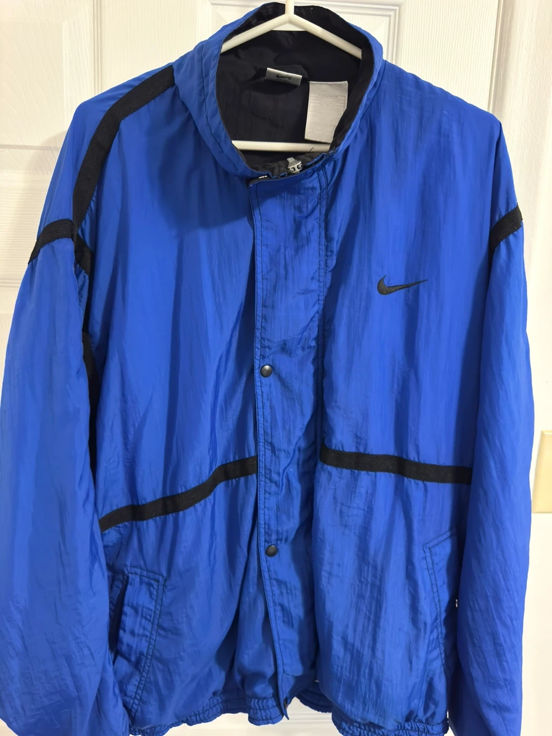 Selling a Nike windbreaker jacket in blue and black. It's in great condition and perfect for layering! The jacket features a zipper and button closure, as well as the classic Nike swoosh logo. Made in Malaysia. It's a stylish and functional piece for any wardrobe