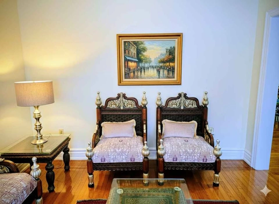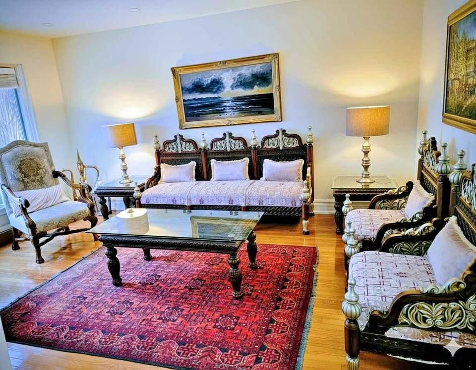 Stunning 3-piece living room set. Solid carved rosewood with beautiful ornate details. Light patterned upholstery. Set includes: 1 x Triple-Arched 3-Seater Sofa, 2 x Matching Armless "Throne" Chairs. Matching glass top coffee table and side tables also available separately. Material: Premium Solid Rosewood (Heavy, durable, and investment-grade). Condition: Pristine / Like New. Fabric: High-end champagne/lavender brocade with matching throw pillows. Style: Regal / Ornate / Colonial. This is authentic, heavy-weight Rosewood furniture. Please bring adequate help for transport.