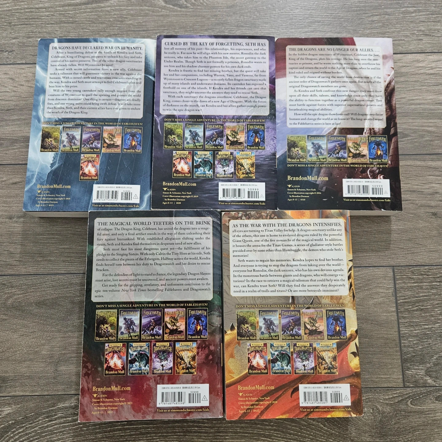 Collection of 5 Dragonwatch books by Brandon Mull. Includes "Wrath of the Dragon King", "Master of the Phantom Isle", "The Dragon with the Stone Heart", "Return of the Dragon Slayers", and "Champion of the Titan Games". Books are paperback. Selling as serries.