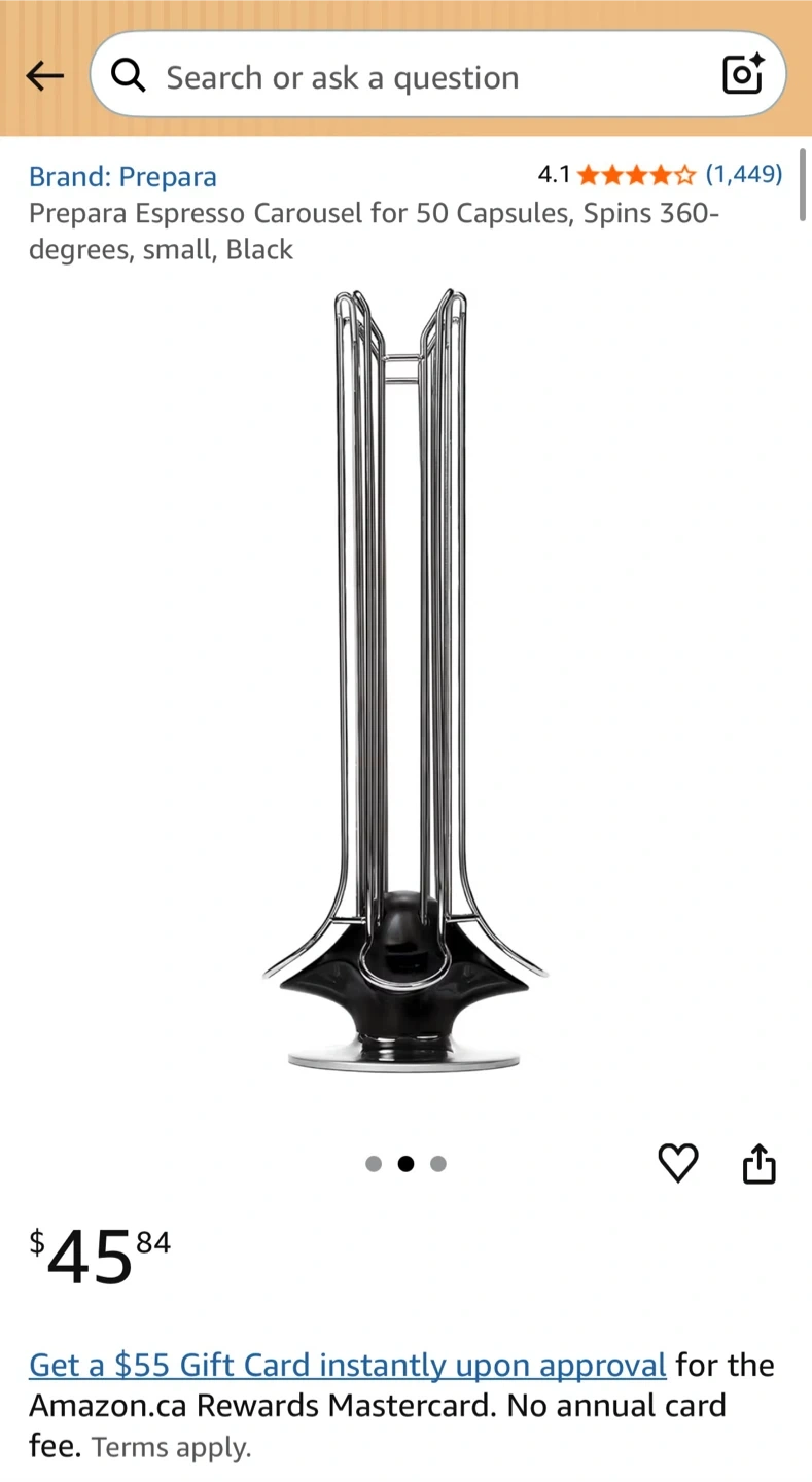 This Prepara espresso carousel stores up to 50 capsules and spins 360 degrees. It's made of metal and plastic. This carousel is perfect for keeping your espresso capsules organized and easily accessible!