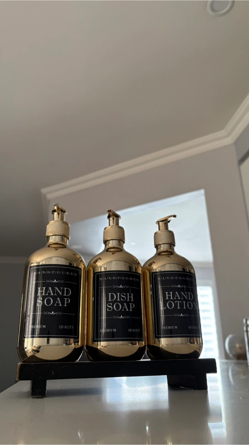 Almost new, stylish gold dispenser bottles for your kitchen. Luxury Set includes one for hand soap, one for dish soap, and one for hand lotion. These premium bottles add a touch of elegance to any counter space! The labels are waterproof. Won’t get damaged with running water when you clean dispensers. Black tray is not included. There are no scratches on dispenser.