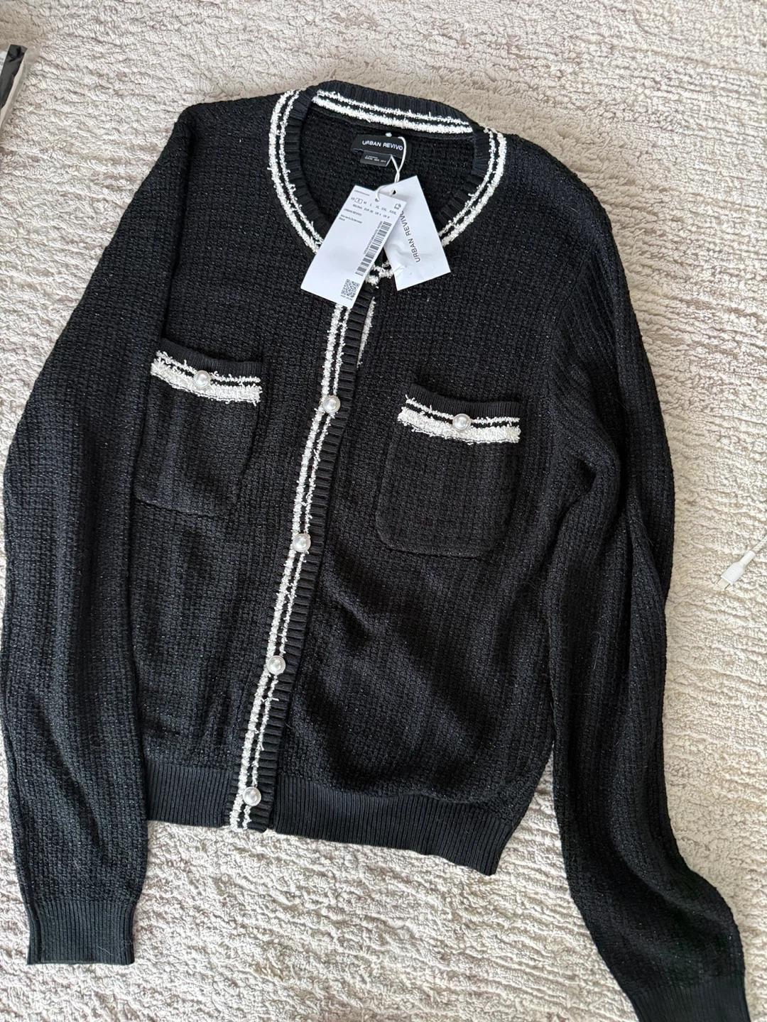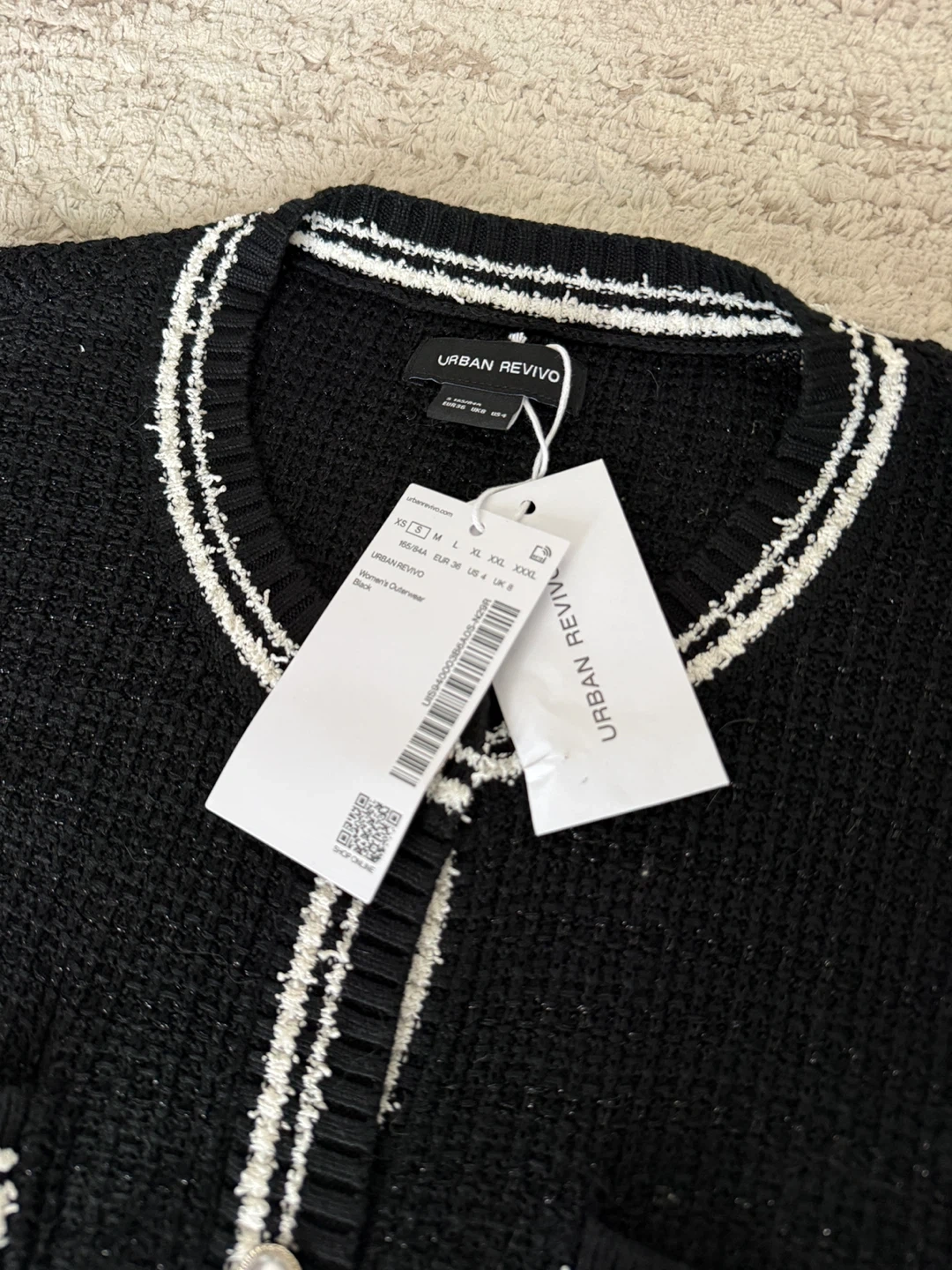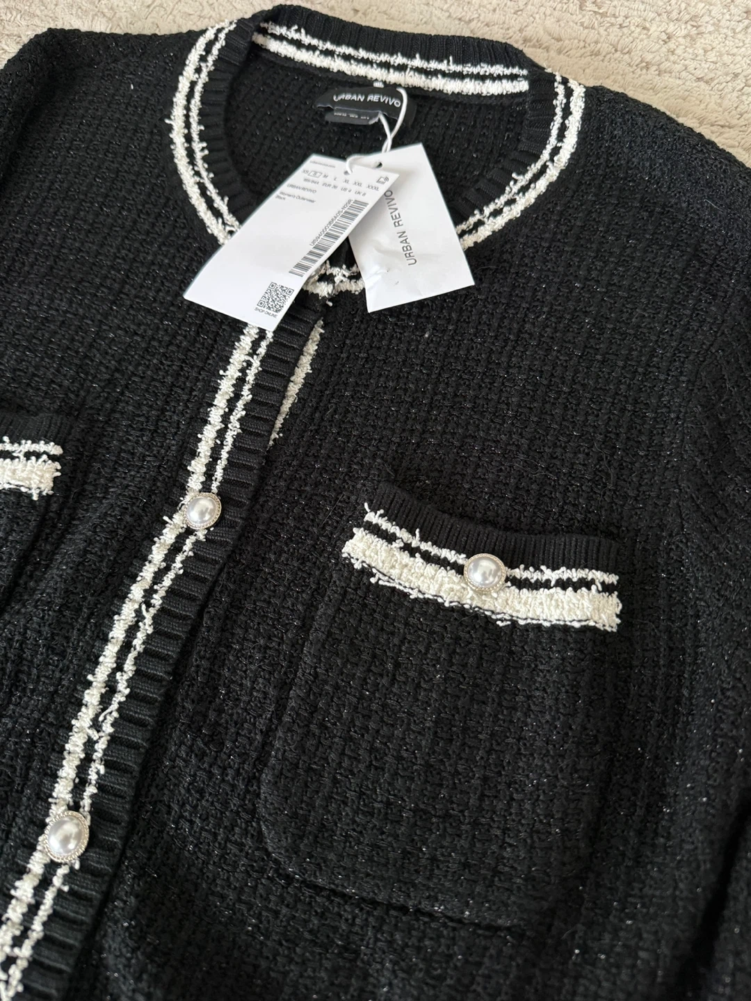 This is an Urban Revivo women's cardigan in black. It's a size small with decorative pearl buttons and contrasting white trim. The material is a textured knit, perfect for layering.