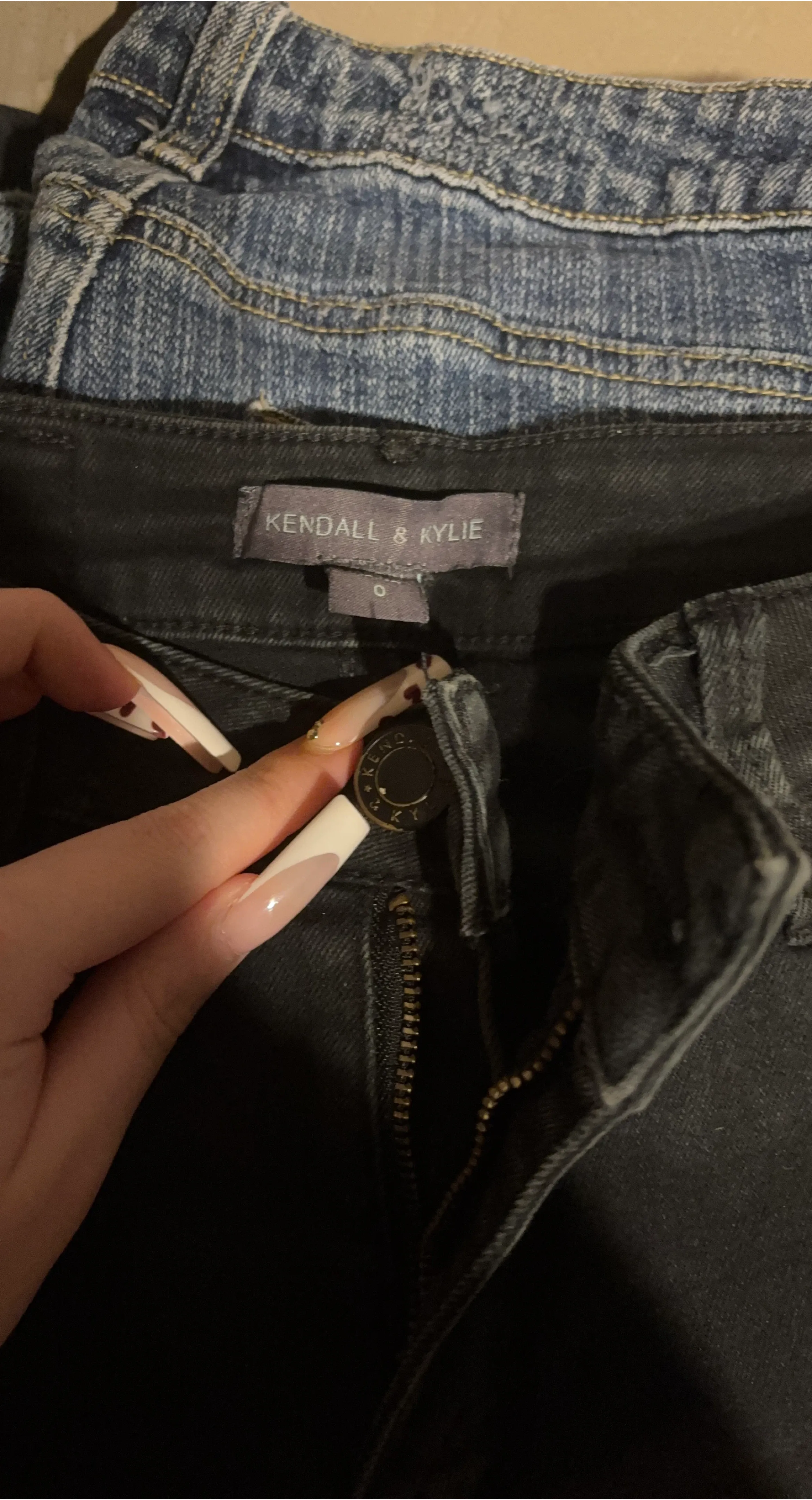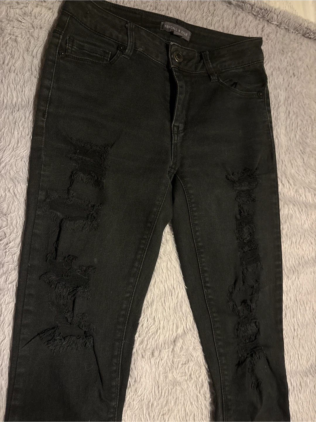 black skinny jeans from Kendall & Kylie. They feature distressed detailing on the legs. Made from a comfortable denim material. Size 0