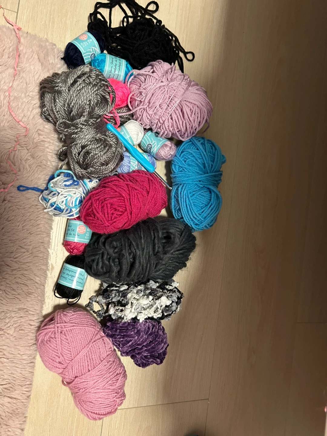 A collection of yarn skeins in various colours including pink, grey, blue, and black, along with a crochet hook. Some skeins are labelled 'Mini Yarn Skeins'. This lot is great for your next crafting project!