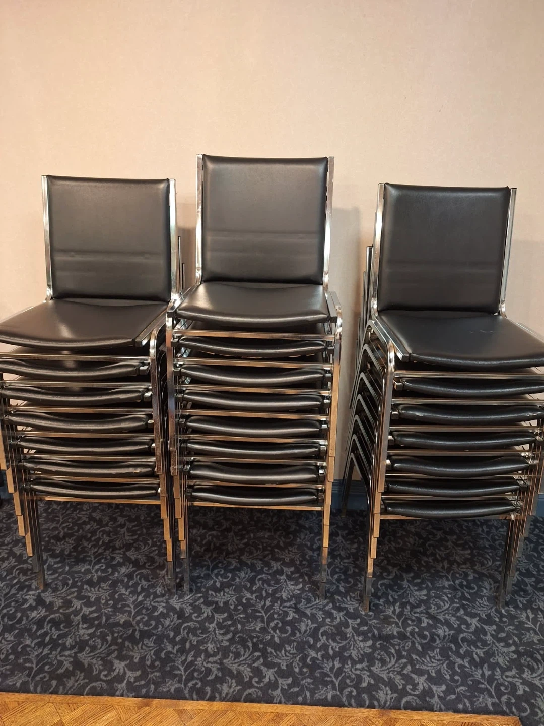 Selling stackable black chairs. These are in great condition and perfect for events or extra seating. The chairs feature a sleek chrome frame and a comfortable black seat and back. Easy to store and transport!