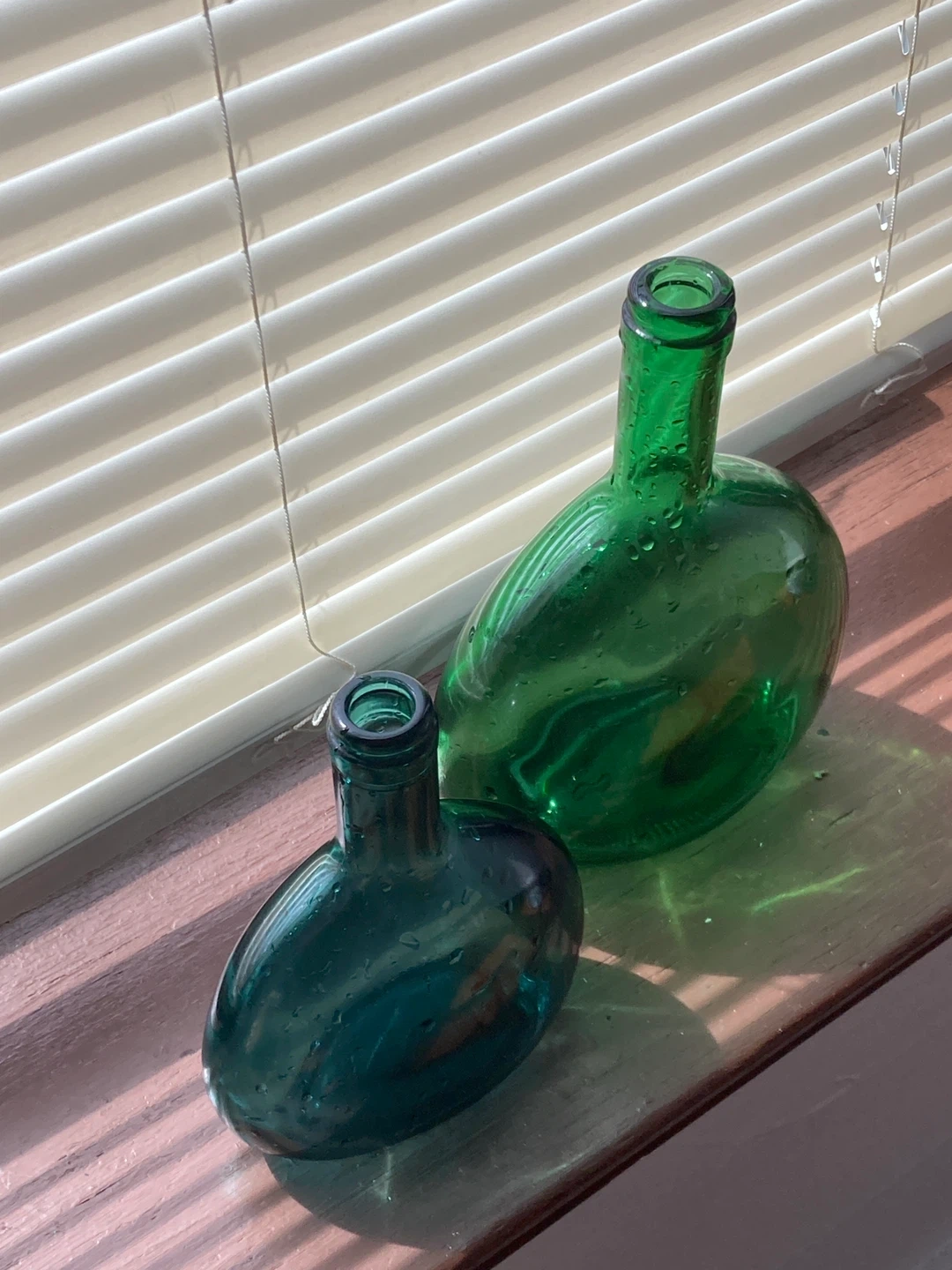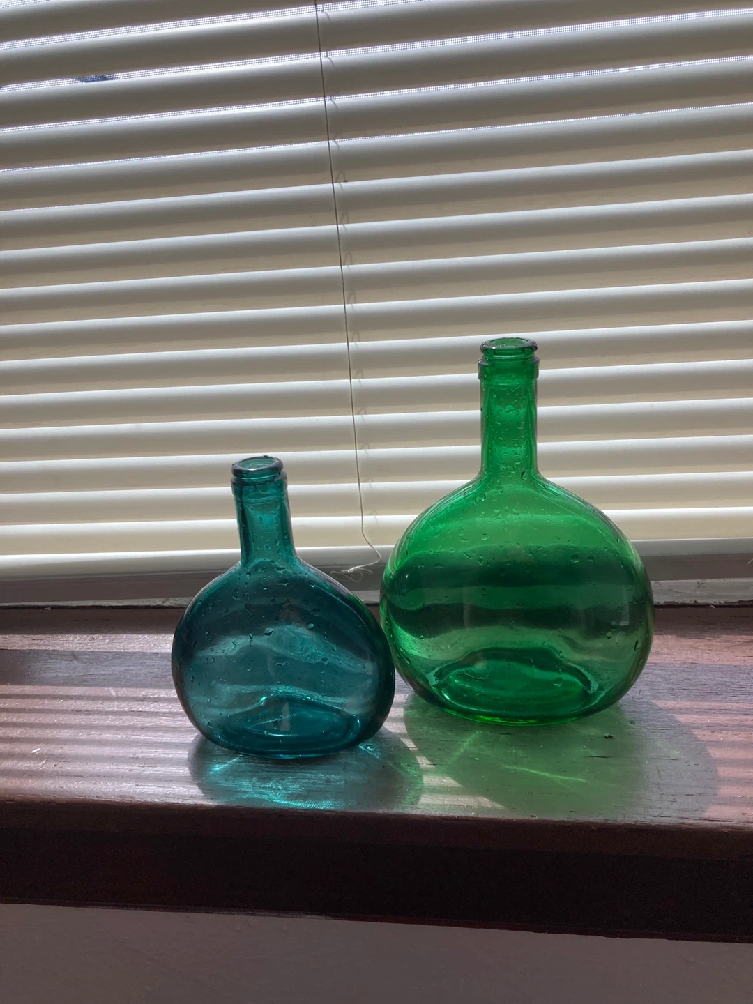 A set of two decorative glass bottles. One bottle is a deep teal color and the other is a vibrant green. Both bottles have a round body and a slender neck.