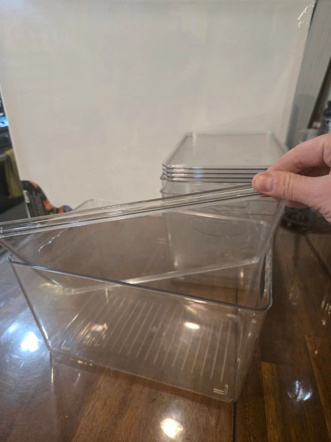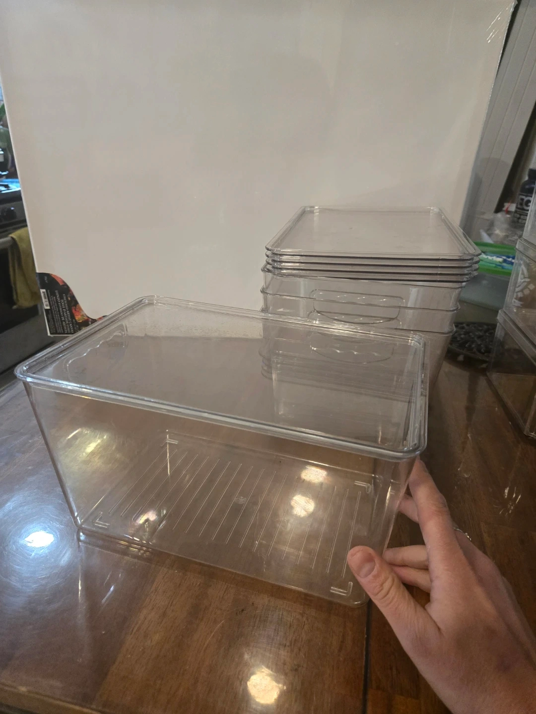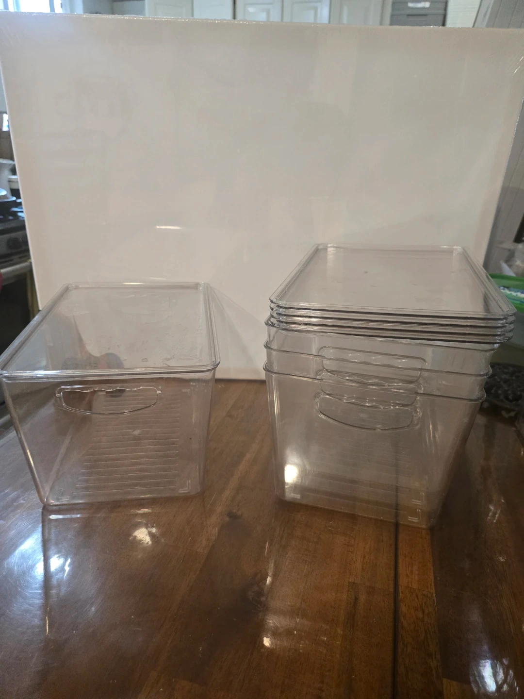 Five clear plastic storage bins with matching lids. These bins are stackable and feature handles. Perfect for organizing your pantry, fridge, or craft supplies!