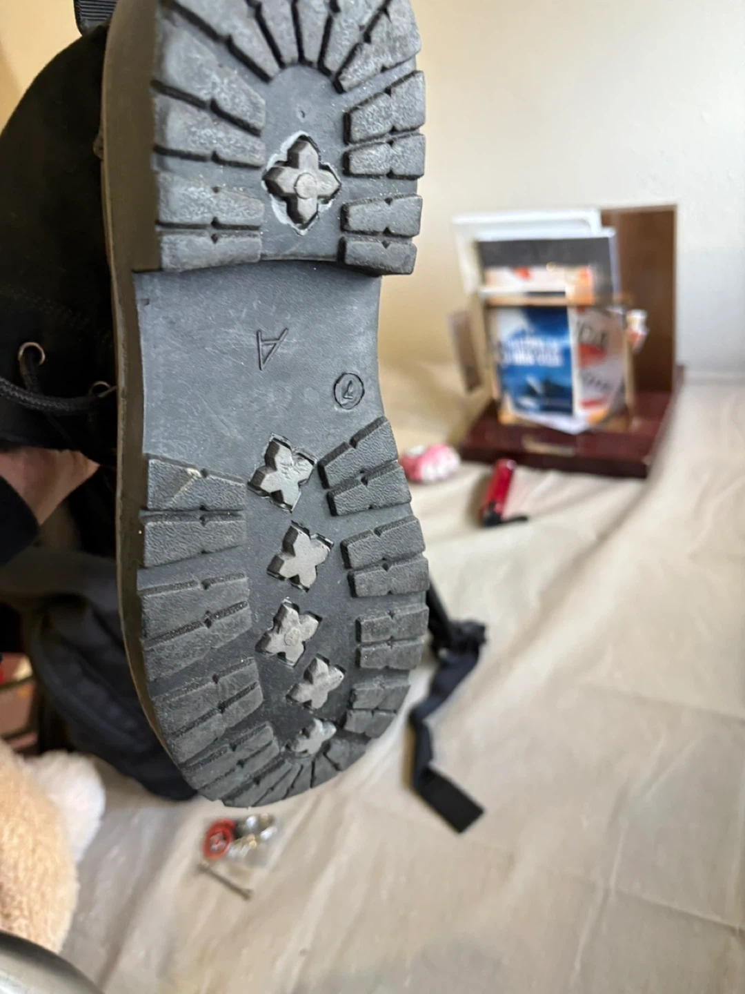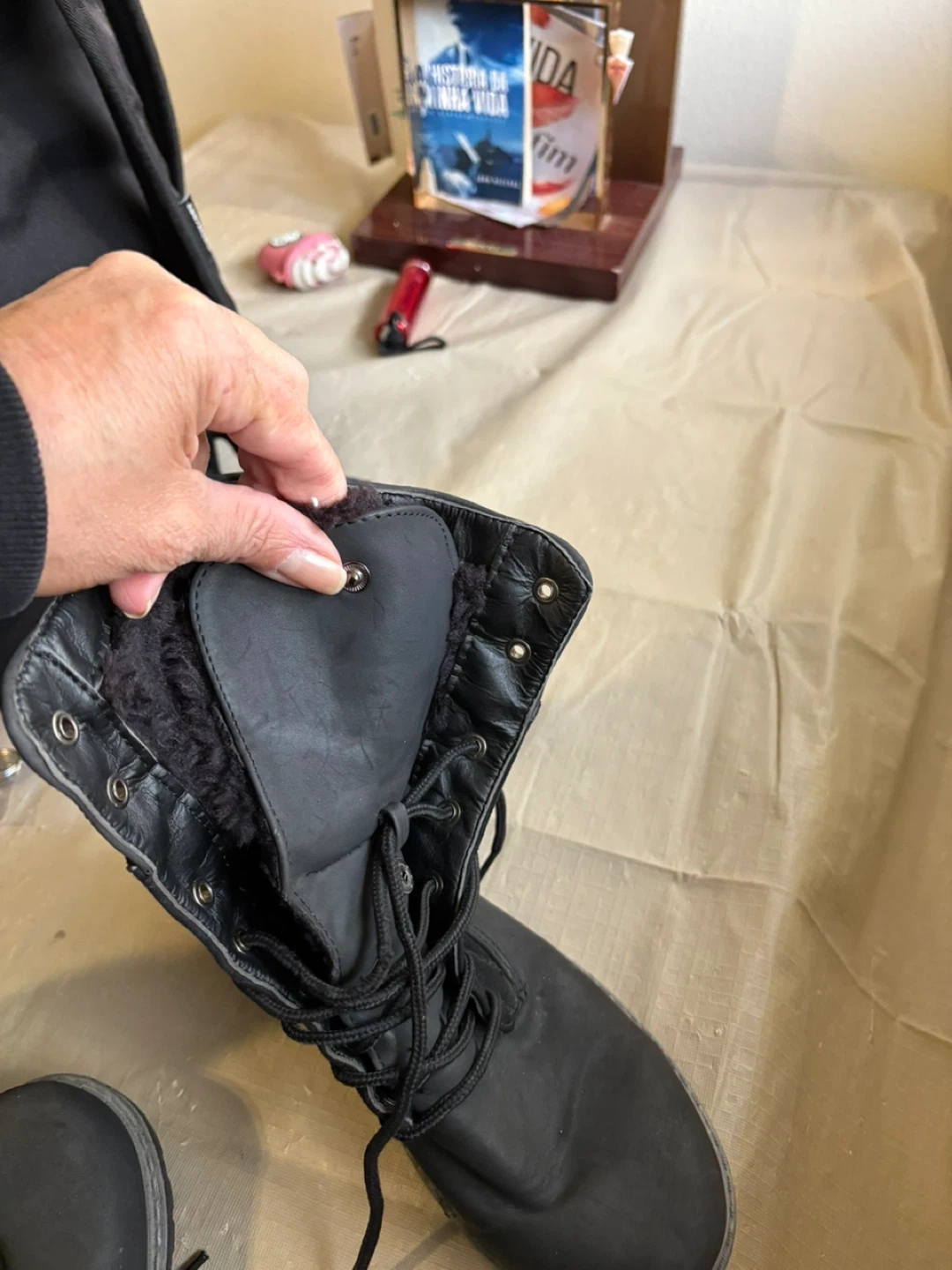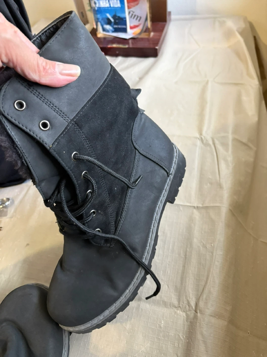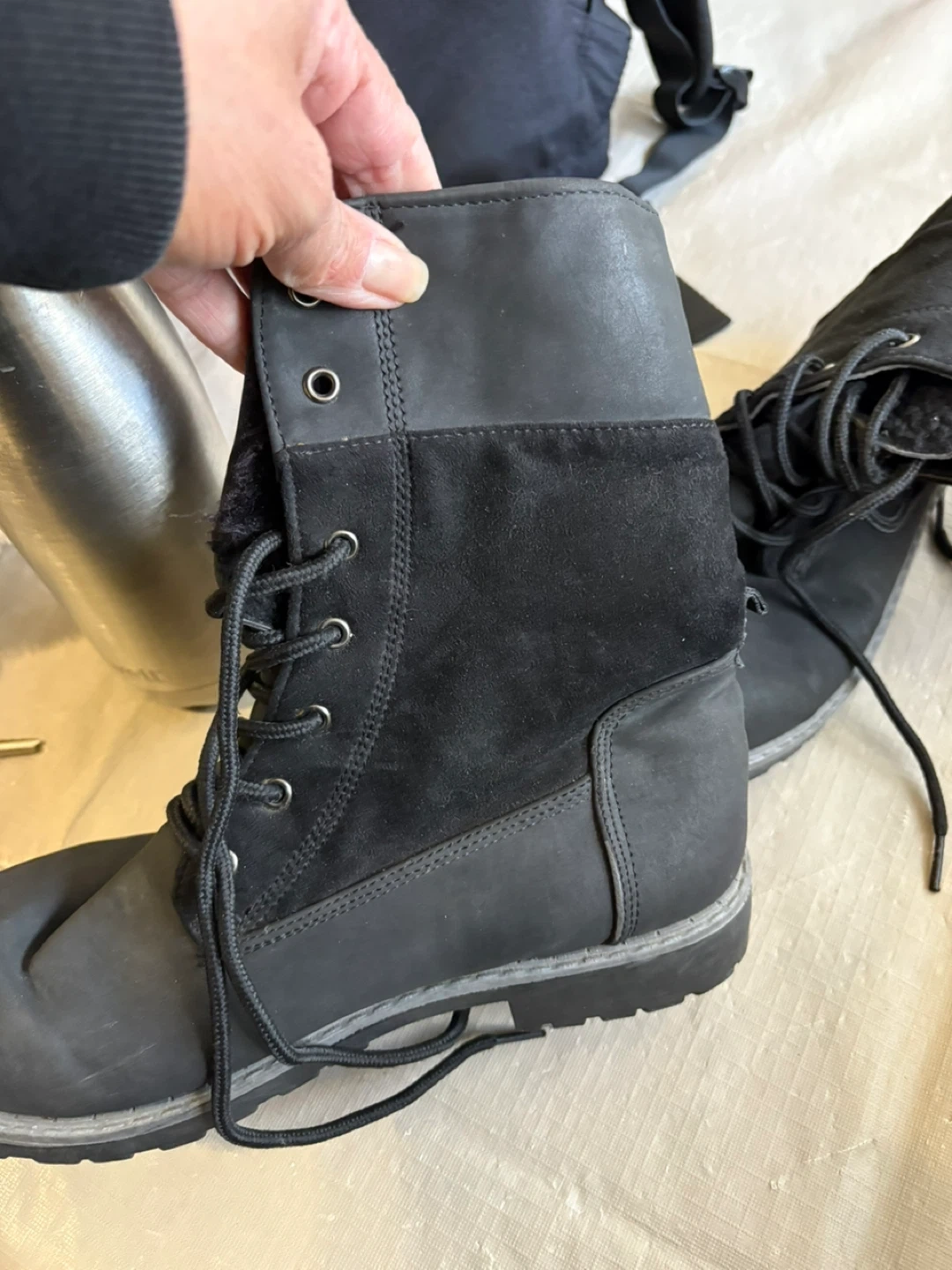 Black winter boots with faux leather and suede accents. They feature a lace-up front and a cozy faux fur lining. The durable rubber sole provides good traction. Size is 7.