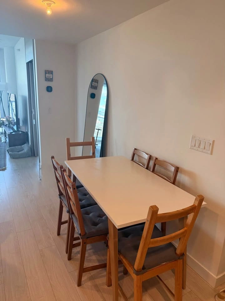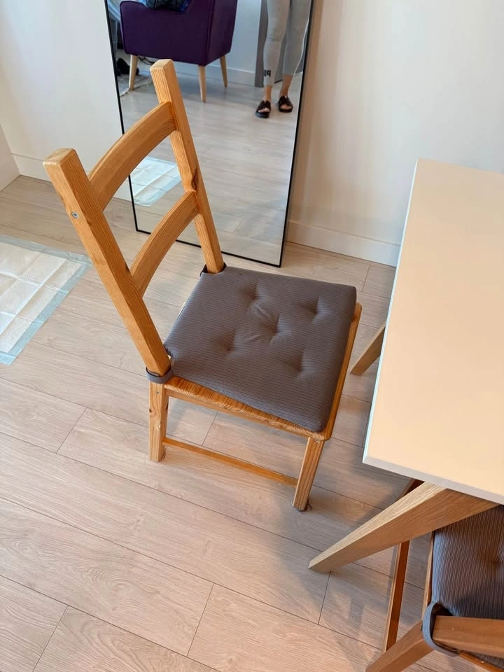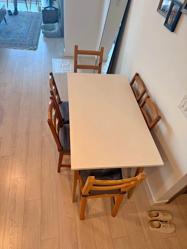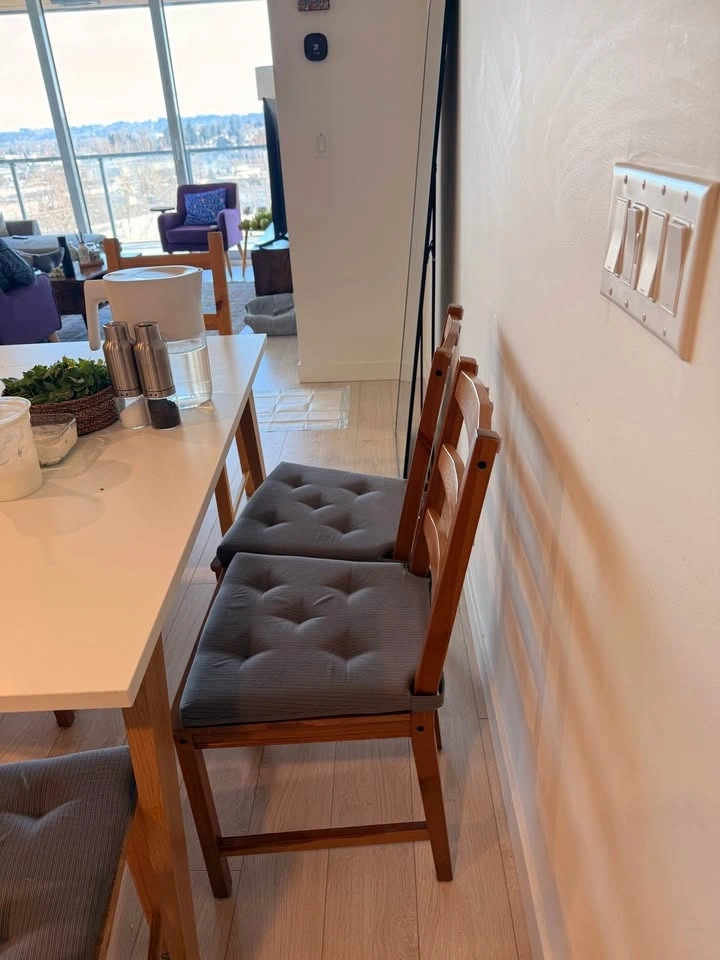 Bought this set 4 months ago for $631.32. Selling because I need a larger dining set for 8 people. Overall in excellent condition, no scratches or damage on the chairs, table, or chair pads. There’s only a small minor defect on one edge (shown and marked in the last photo). Other than that, everything is in great shape. All 13 pieces for $350. Pick up in Burnaby.