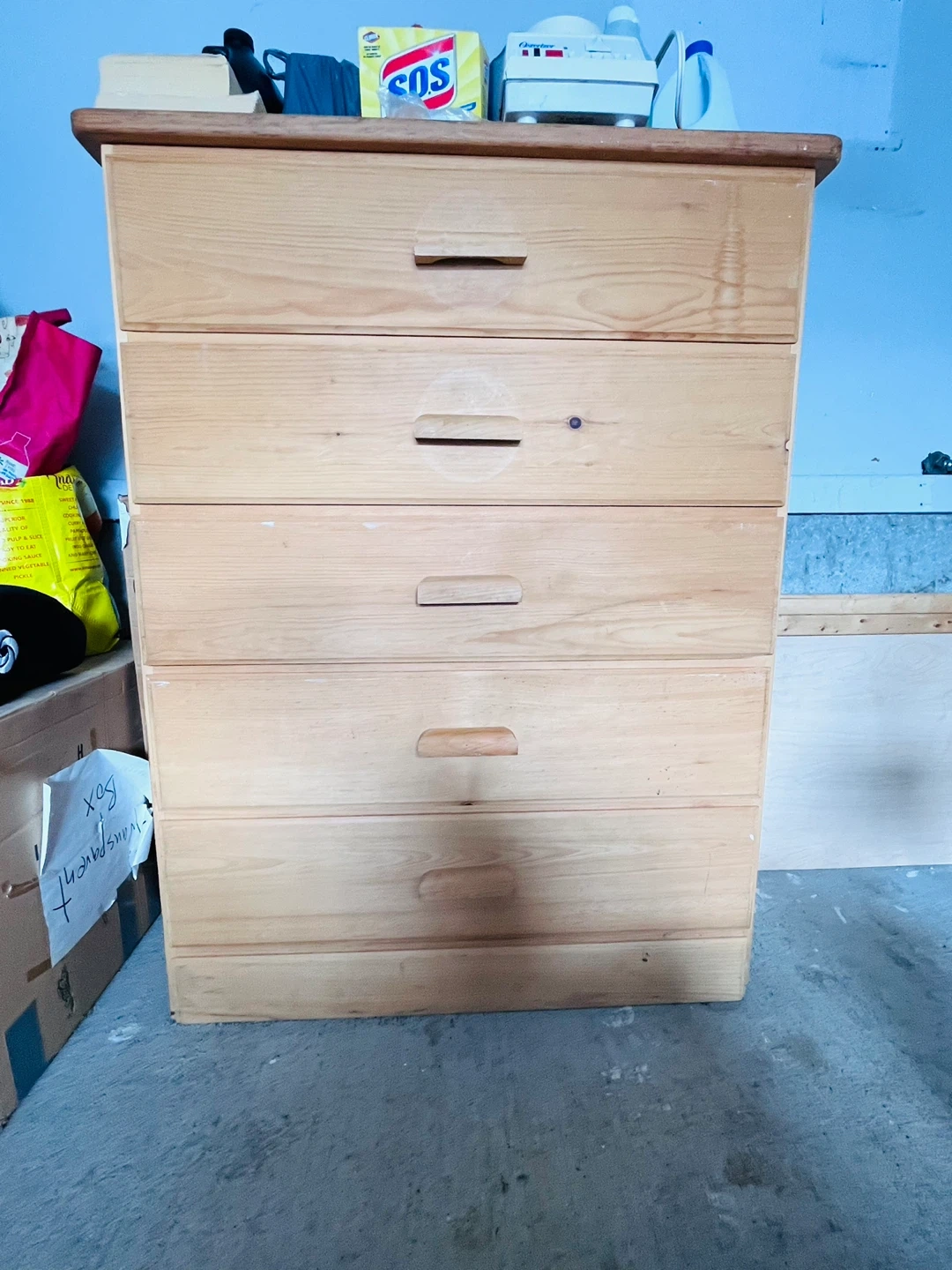 A solid wood dresser with five drawers. The wood is light-coloured pine. It's perfect for organizing clothes or linens in a bedroom or closet.