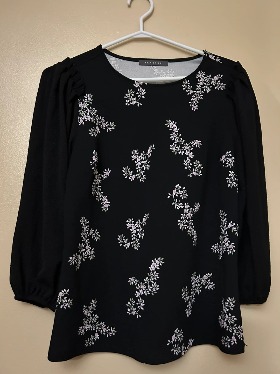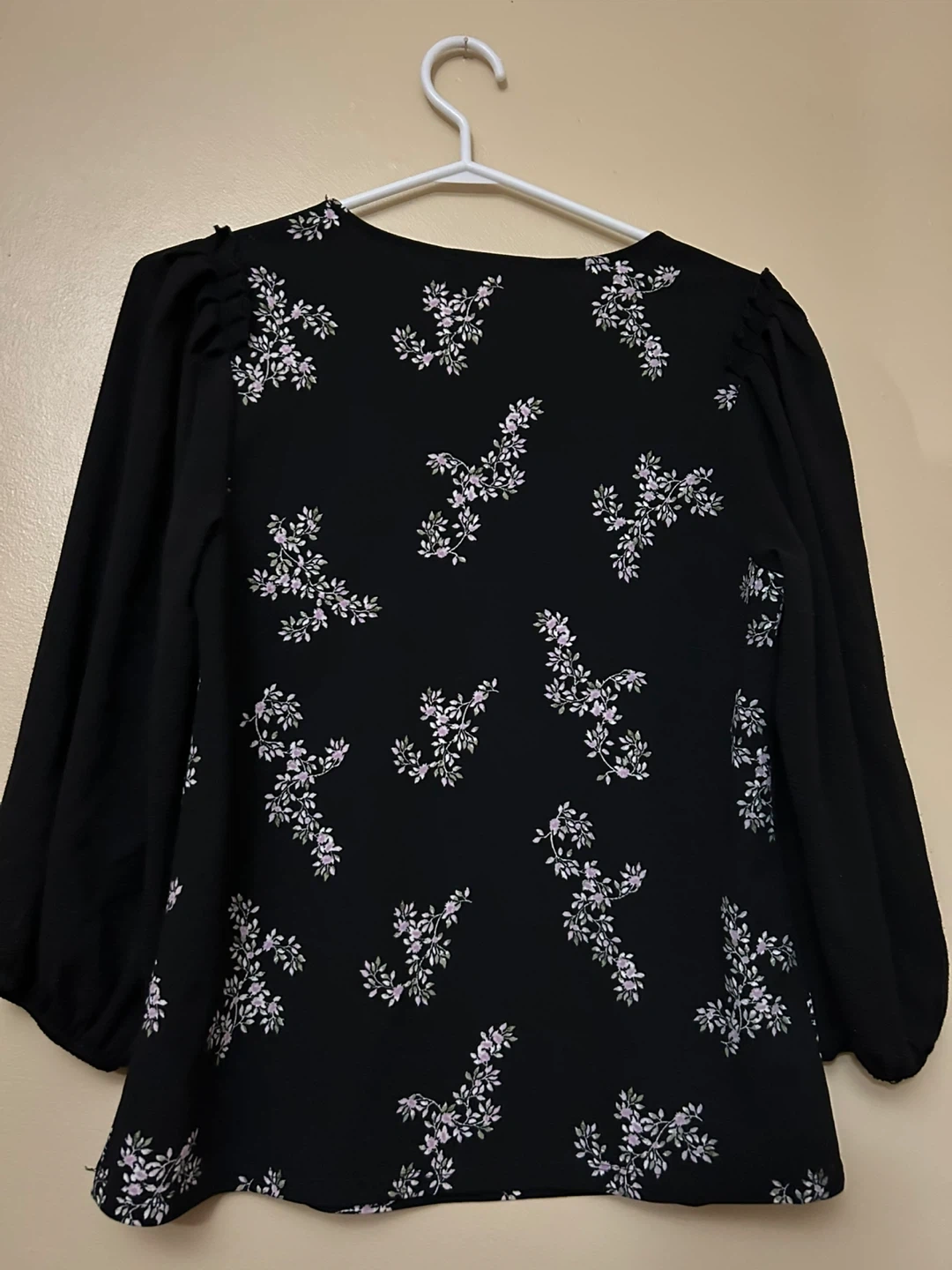Elevate your wardrobe with this stylish woman's black blouse, adorned with a delicate floral print and featuring elegant 3/4 sleeves. This used blouse is in excellent condition, ready to add a touch of sophistication to any outfit. Perfect for both casual and semi-formal occasions. The blouse is pre-loved but well-maintained, ensuring you receive a quality garment.