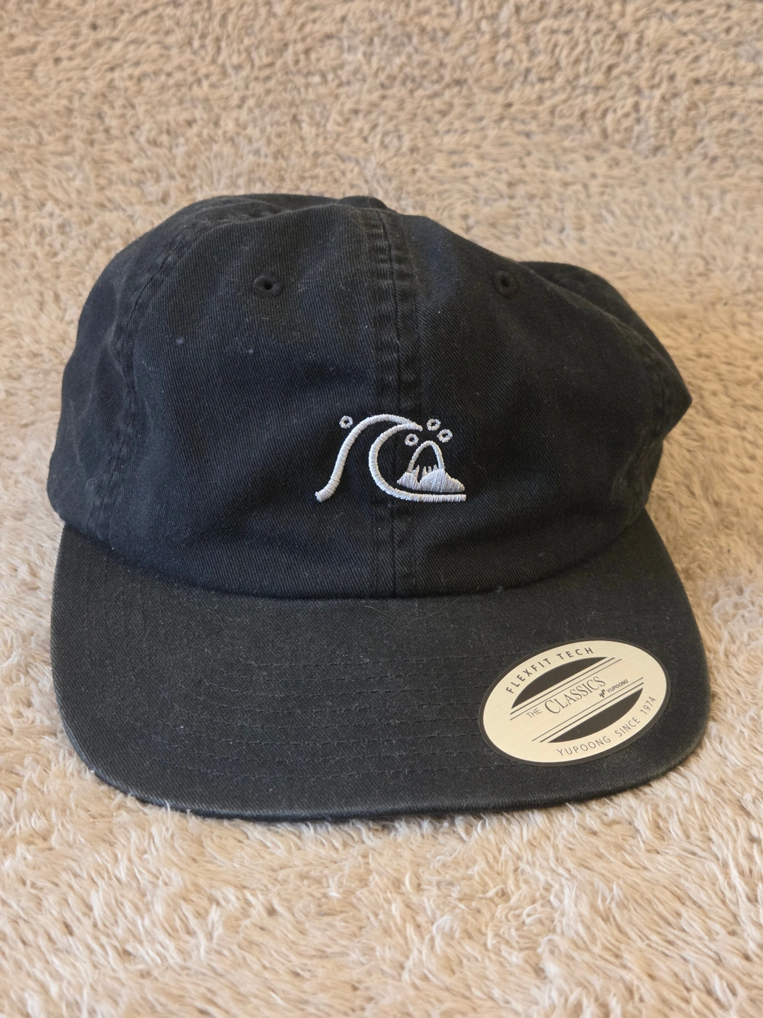 Clean black Quiksilver dad cap with a classic low-profile fit. Soft cotton twill, curved brim, and a leather strap with metal buckle for easy adjusting. Simple embroidered wave logo on the front. Tagged OSFM; built on the Yupoong “The Classics” base with Flexfit tech for comfort.