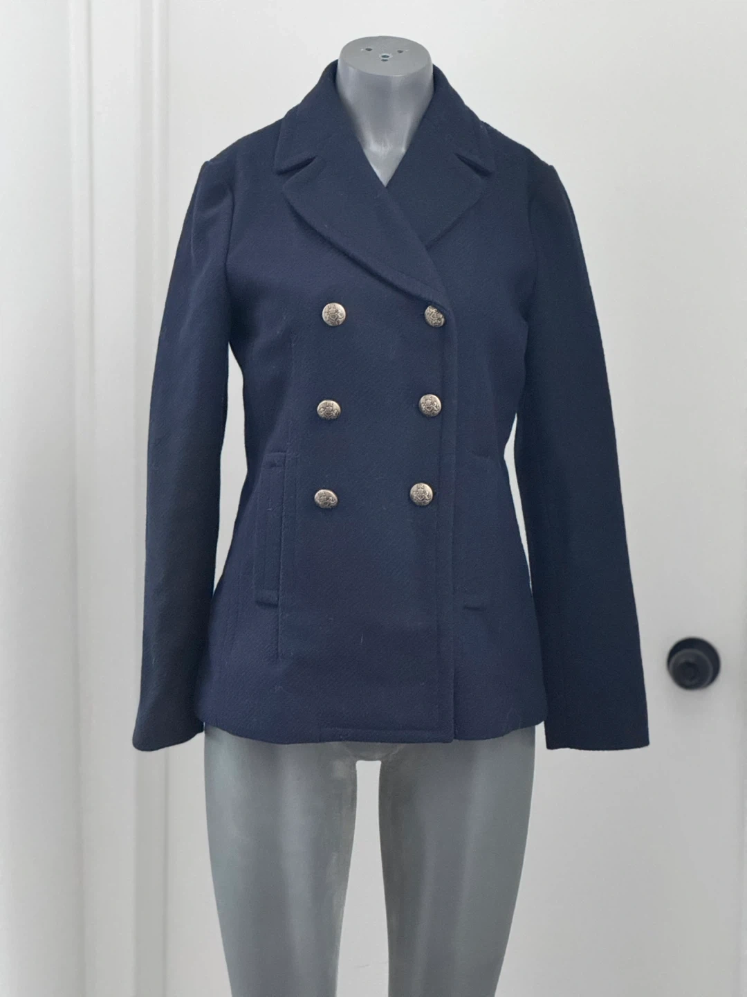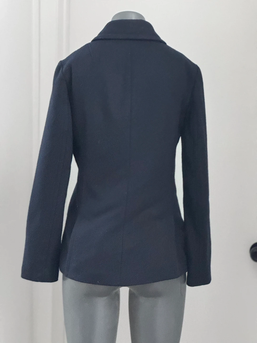 Banana Republic navy double-breasted blazer. Shell: 42% wool, 36% polyester, 22% rayon. Sleeve lining: 100% polyester. Made in the Philippines. Size S/P. Never worn