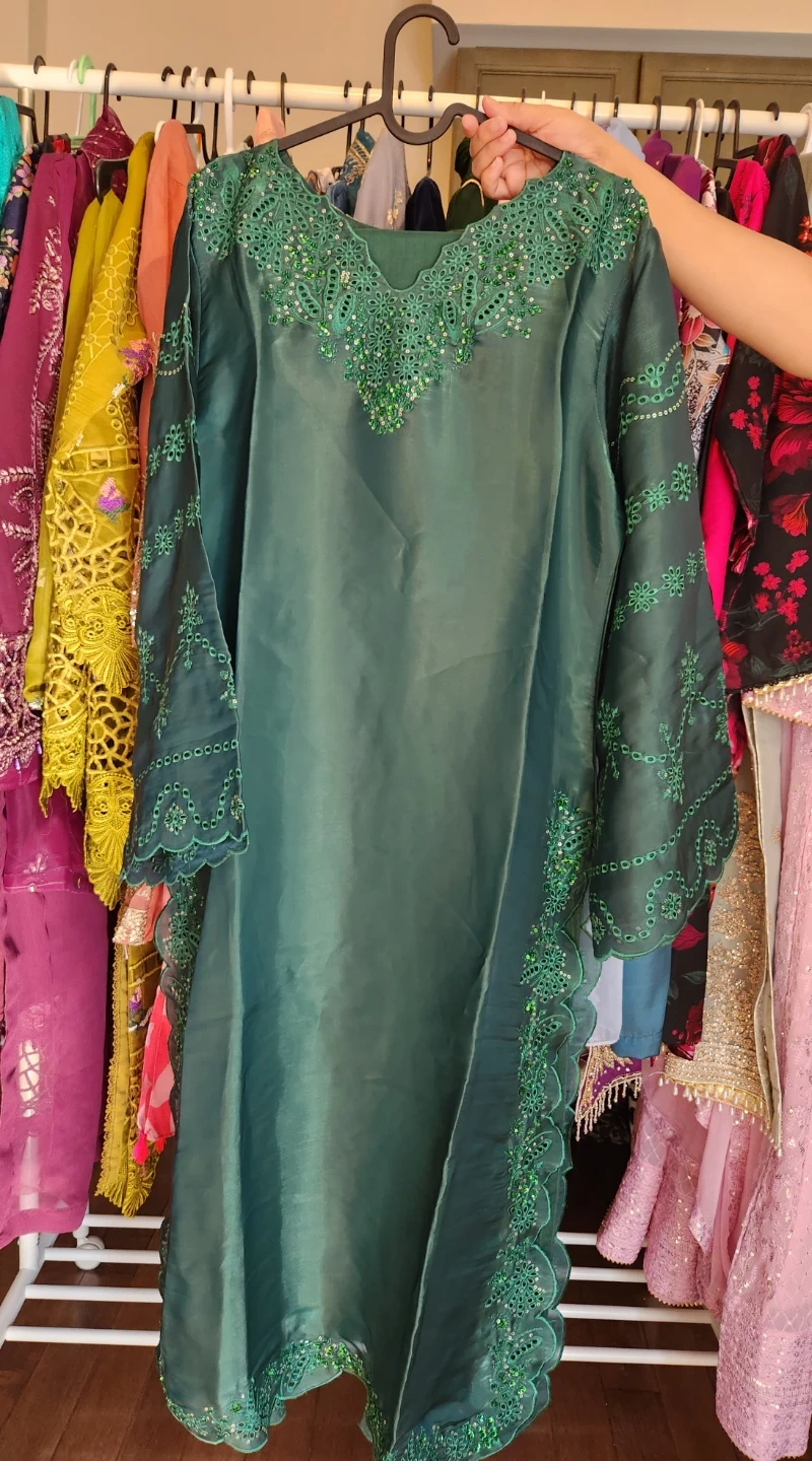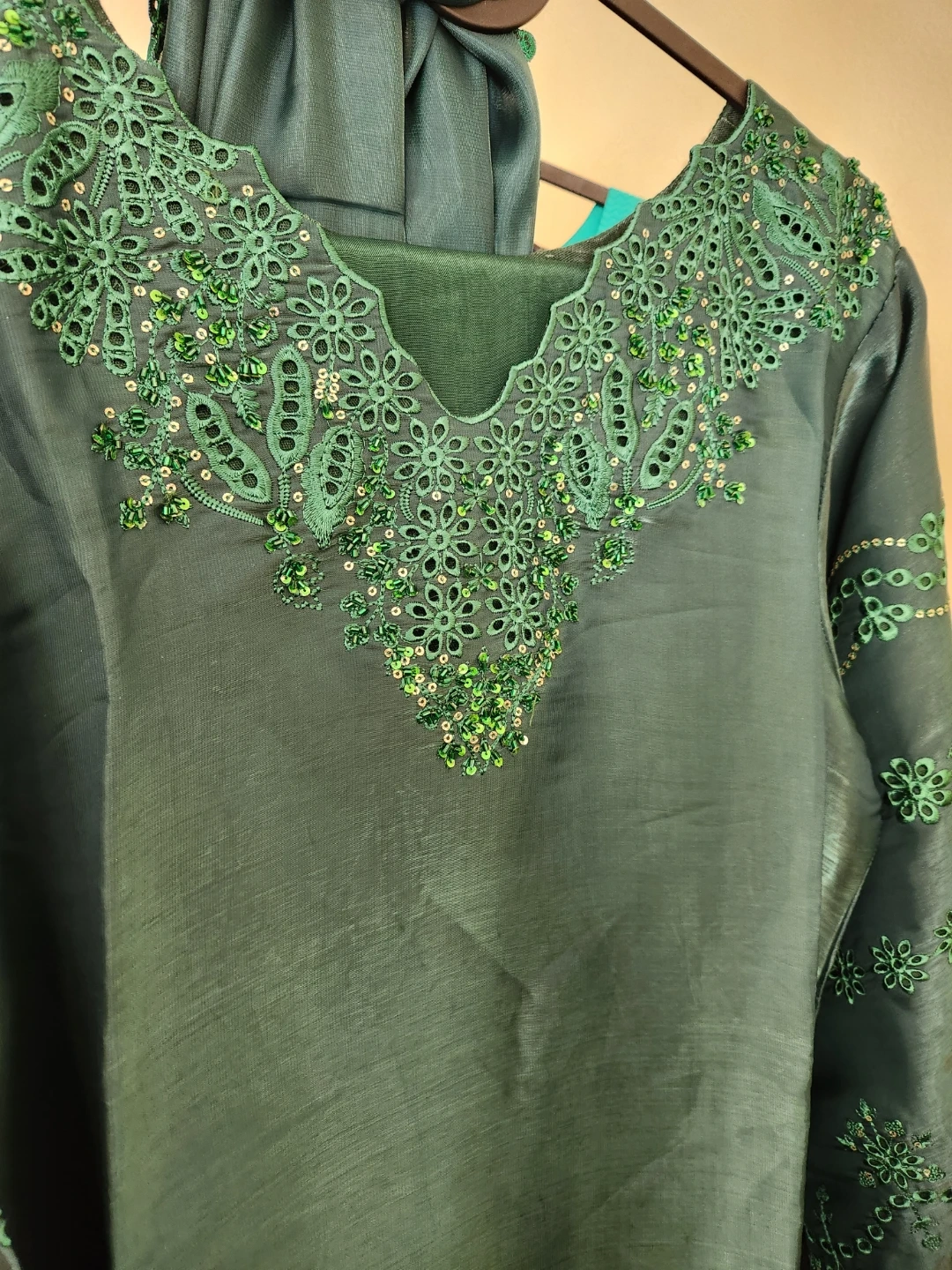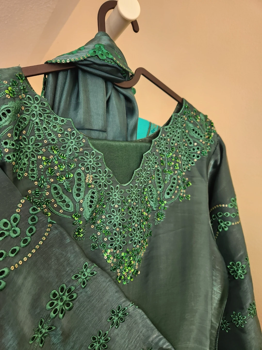 Luxurious sheesha silk suit with Embroidered sequence work and cut work in an elegant colour