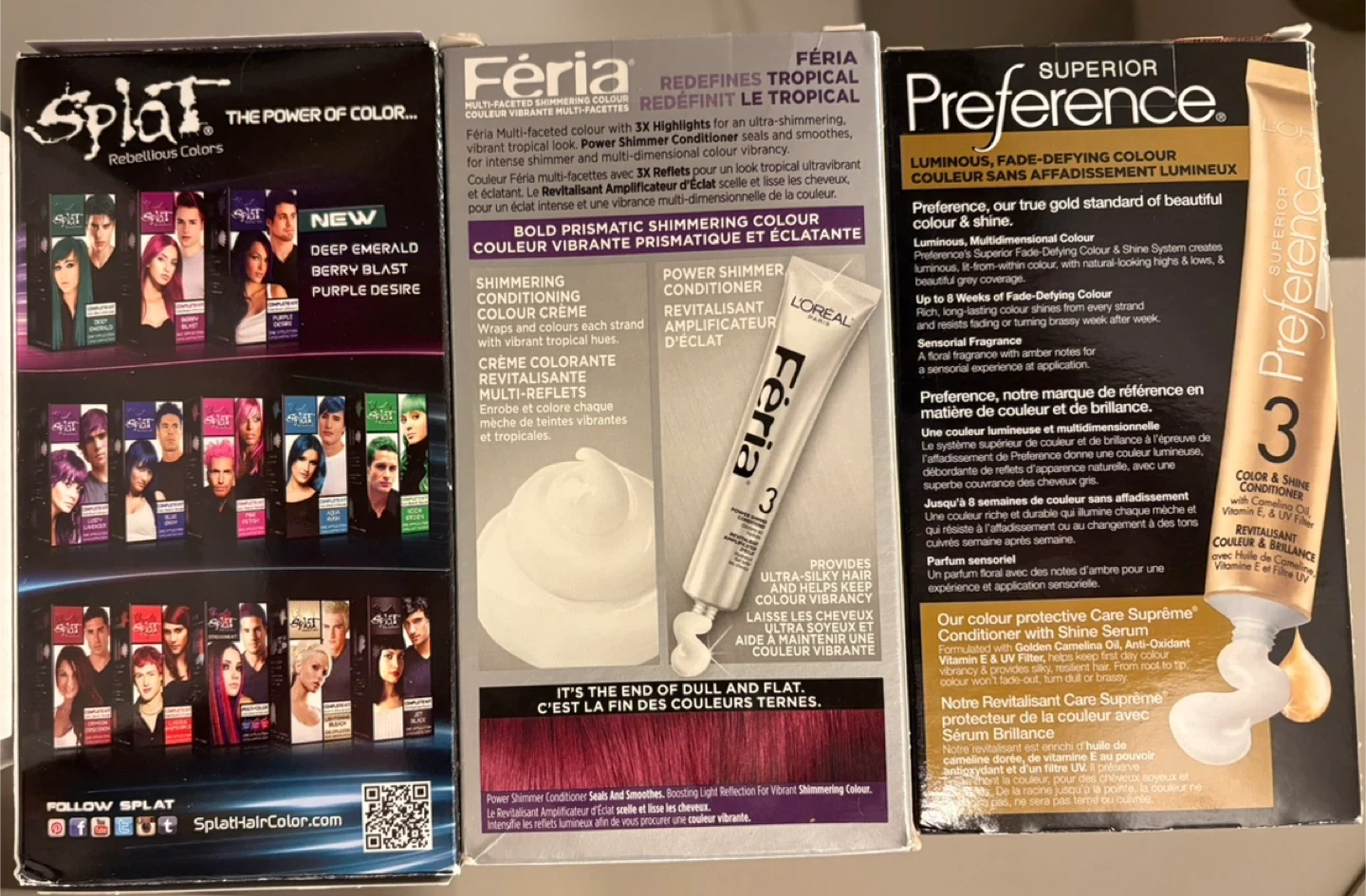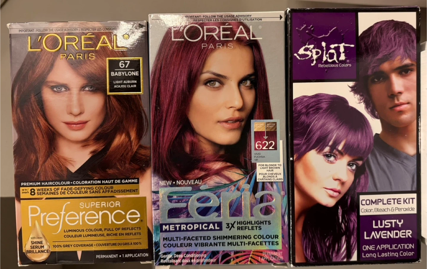 Includes L'Oréal Paris Superior Preference hair colour in 67 Babyone and 622 Vivid Fluida. Also includes a Splat Lusty Lavender complete kit. These are permanent hair colours with fade-defying colour and shine. The L'Oréal Preference includes a Shine Serum conditioner. $10 each. 😊