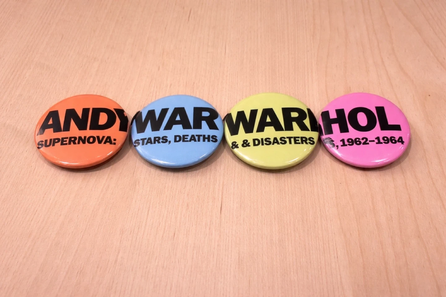 Set of 4 colourful Andy Warhol pins from the “Supernova: Stars, Deaths & Disasters 1962–1964” exhibition held at the Art Gallery of Ontario in 2006.