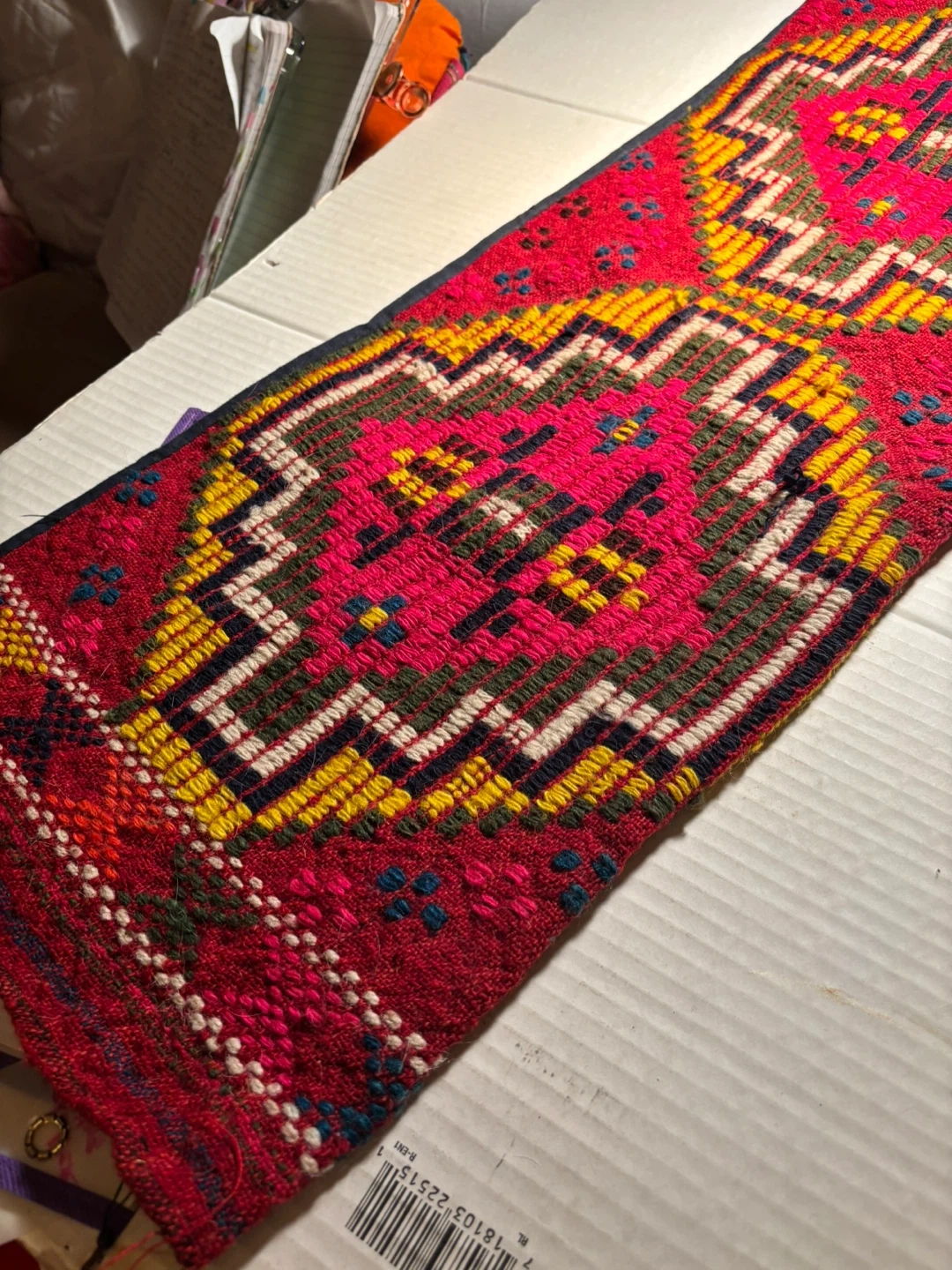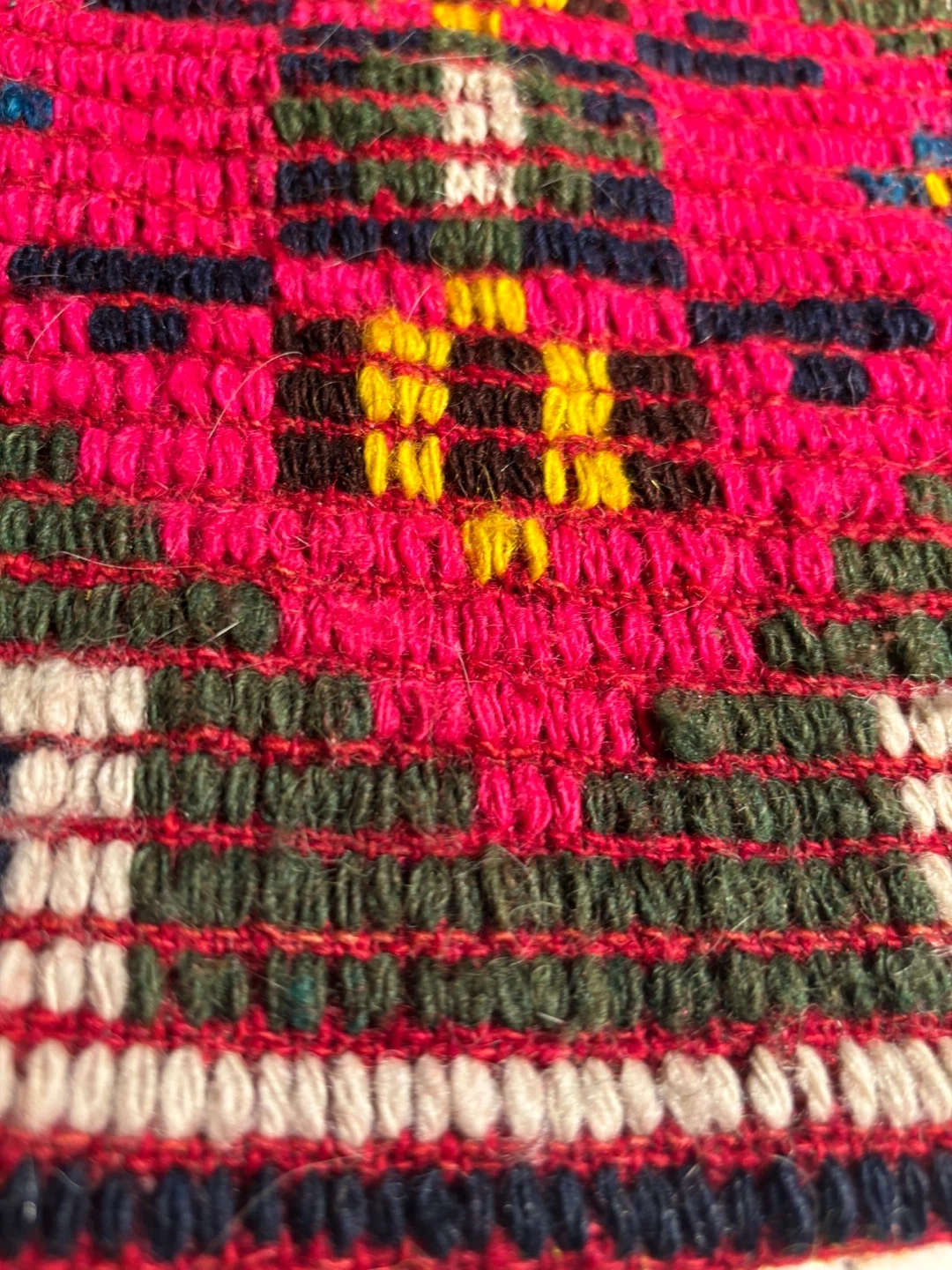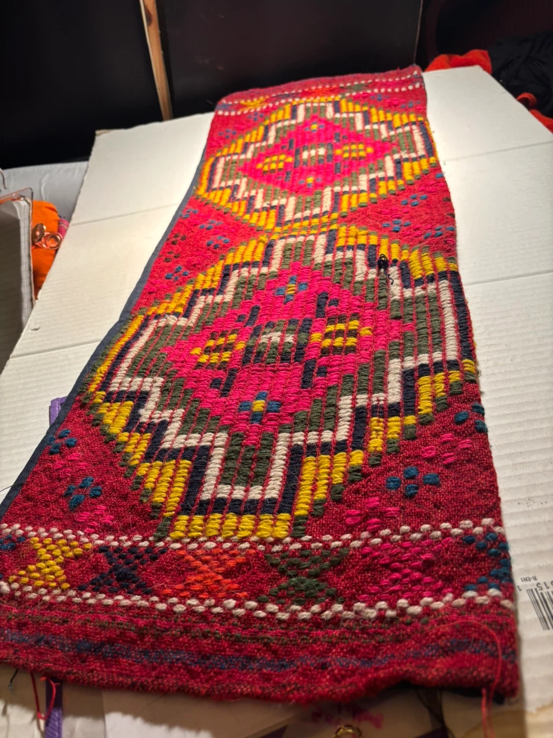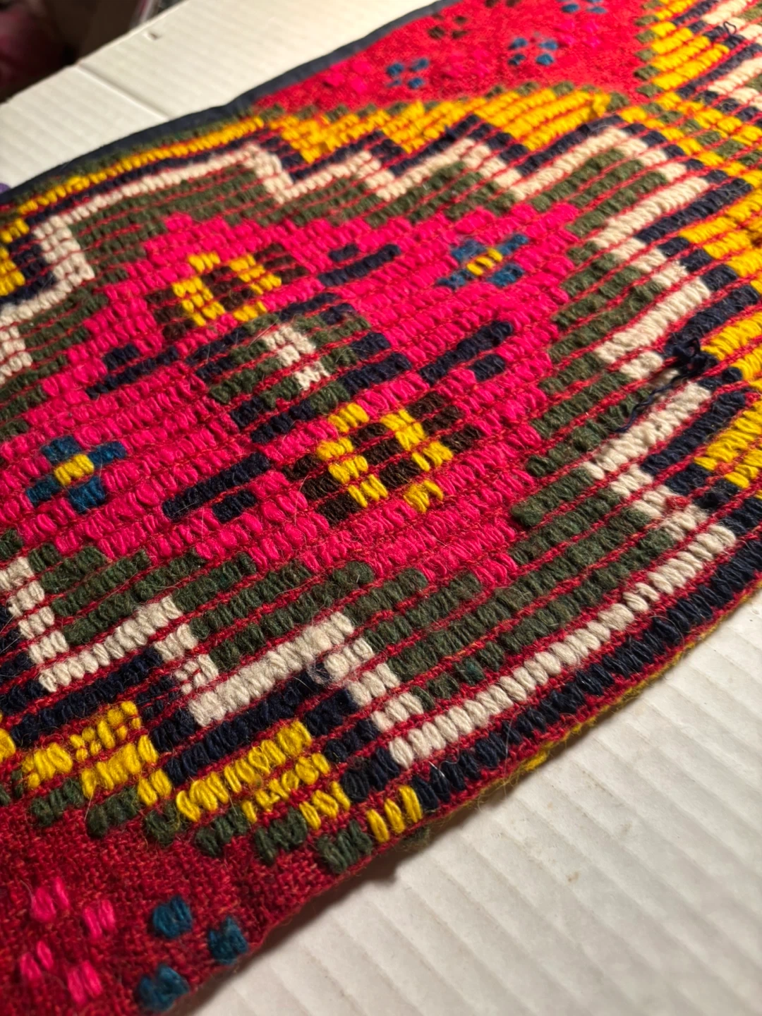 This is a handcrafted Bulgarian wooo textile with a vibrant geometric design, can be used as a pillowcase as the underside is pocket- shaped - It features intricate weaving in shades of red, pink, yellow, and green. This piece could be used for decorative purposes or as part of a larger craft project. Its unique pattern makes it a striking accent item that brings emotional warmth and luck !