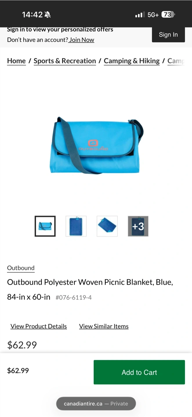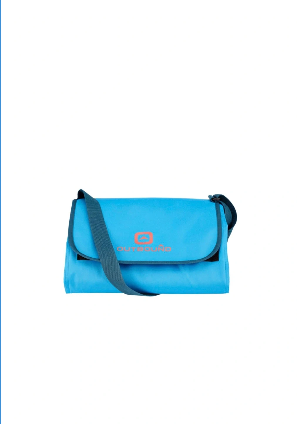 This Outbound picnic blanket is blue and made of polyester woven material. It measures 84 inches by 60 inches. It rolls up into a convenient carrying case with a strap.