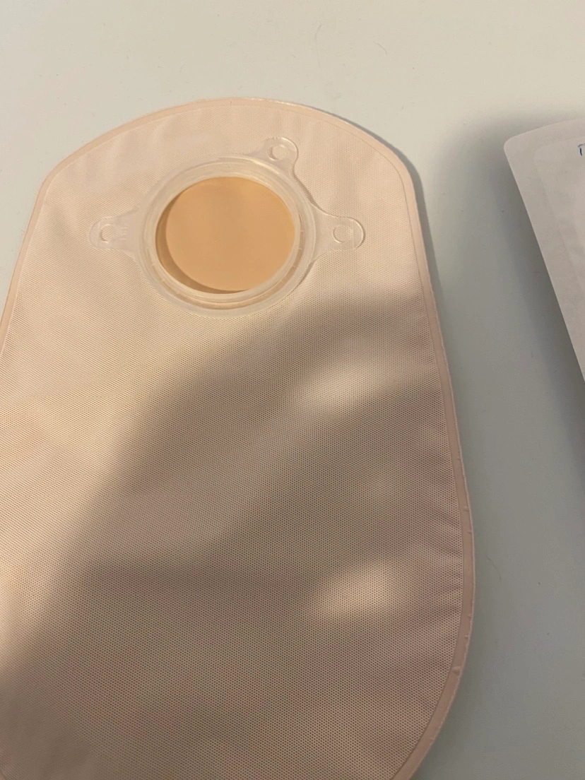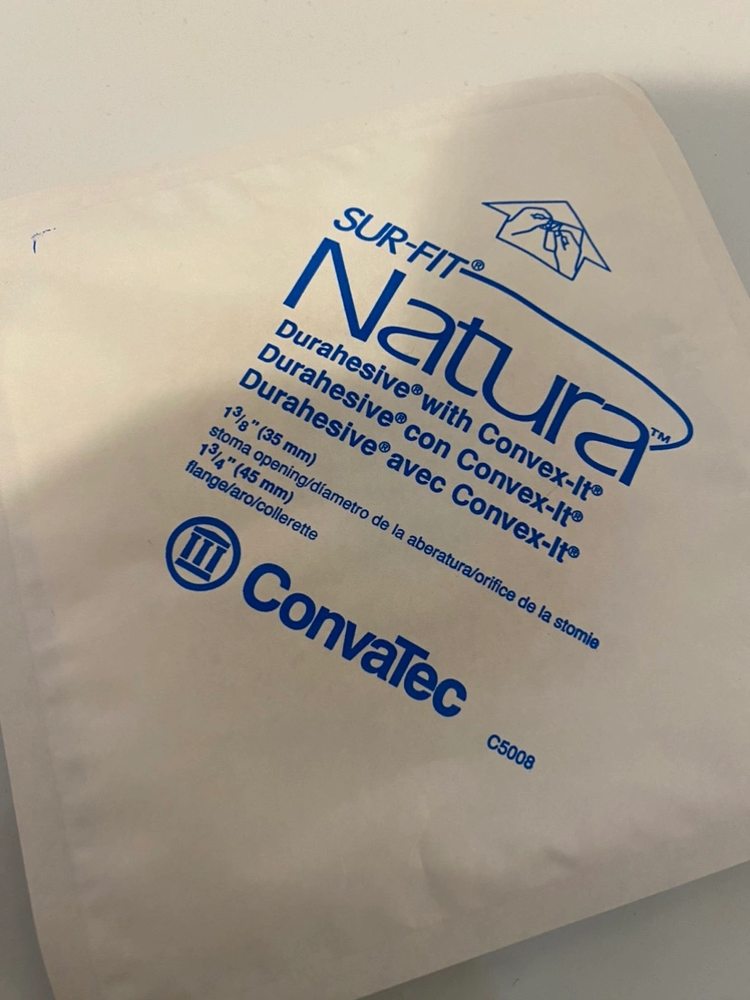 ConvaTec Natura Durahesive Ostomy Pouch with a 1 3/8" opening. The pouch is beige and the flange is brown. It comes in a sealed package with a convex-it insert. The item is brand new. There are 20 bags 1 clip and 15 wafers pre cut at 30 mm